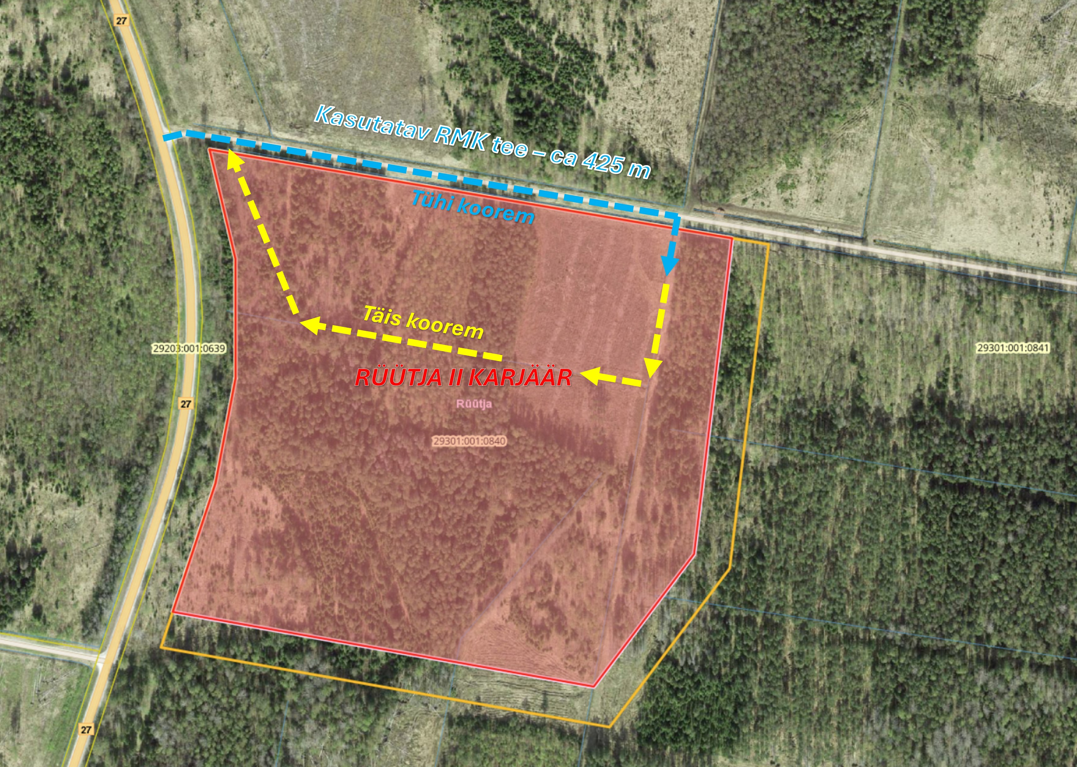 Tere Verston Eesti OÜ-le on Rüütja II karjääris (29301:001:0840) väljastatud kaevandamise keskkonnaluba ning Maa-ja Ruumiametiga sõlmitud maarendileping. Seoses alanud raadamistöödega ning plaaniga avada karjäär juba käesoleva aasta aprilli keskpaigas, sooviksime RMK-ga sõlmida kokkuleppe karjääri juurde viiva tee kasutamise osas. Teed soovime kasutada Rüütja II karjäärist materjalide väljaveoks ning maksimaalne aastane veomaht on 100 000 tonni (~ 3500 koormat) . PS! Täpsustav liiklusskeem lisatud manusena. Lugupidamisega Siim Pukk Mäenduse valdkonnajuht +37256611011 www.verston.ee