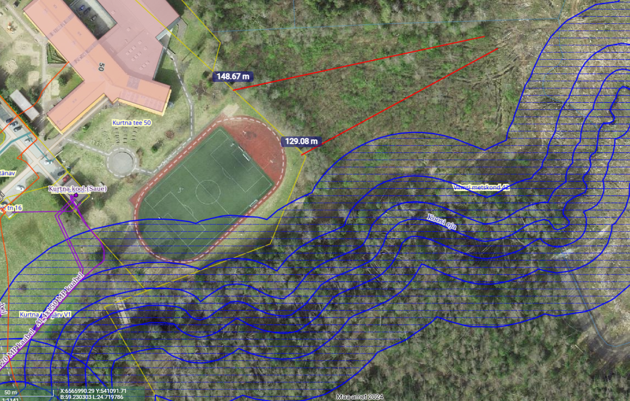 Alguses tuleb kokku leppida kust trass kulgema hakkab. RMK eelistus on, et õhuliin paikneks kooli kinnistul sees, niipalju kui võimalik ja kulgeks kas ühel või teisel pool staadionit. RMK metsas veekaitsevööndis vanas metsas puude raie on komplitseeritud (maastik ka on raske) ja ilmselt ka liini sinna rajamine/postide paigaldamine raske. All joonisel siis kaks trassi kulgemise varianti meie hinnangul RMK maal. Maa on vesine ja tihti liigniiske. Masinaga seal liikumiseks (mainisite sellist vajadust) võib olla vajadus ehitada ka teed.