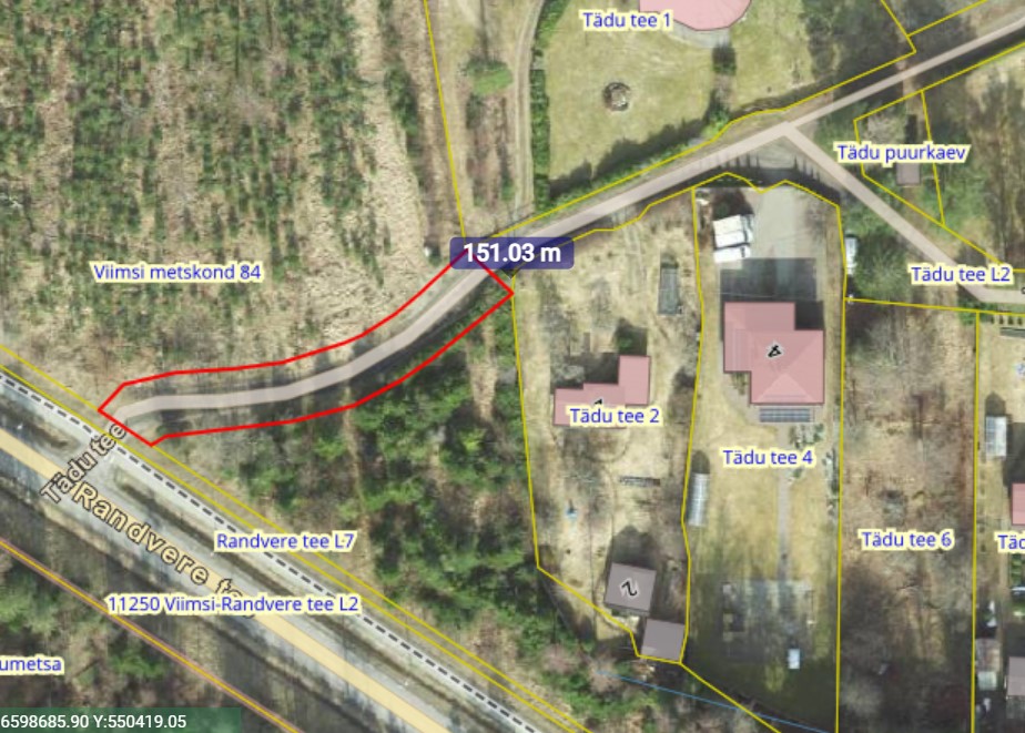 Viimsi vald soovib riigi omandis Kliimaministeeriumi valitsemisel (volitatud asutus Riigimetsa Majandamise Keskus) olevast Viimsi metskond 84 katastriüksusest (katastritunnus 89001:001:0861) välja kruntida kaks Tädu tee lõiku, et ühendada need juba munitsipaalomandis olevate Tädu tee L2 (katastritunnus 89001:001:0992) ja Tädu tee L1 (katastritunnus 89001:001:0993) katastriüksustega ning moodustada terviklik Tädu tee katastriüksus.