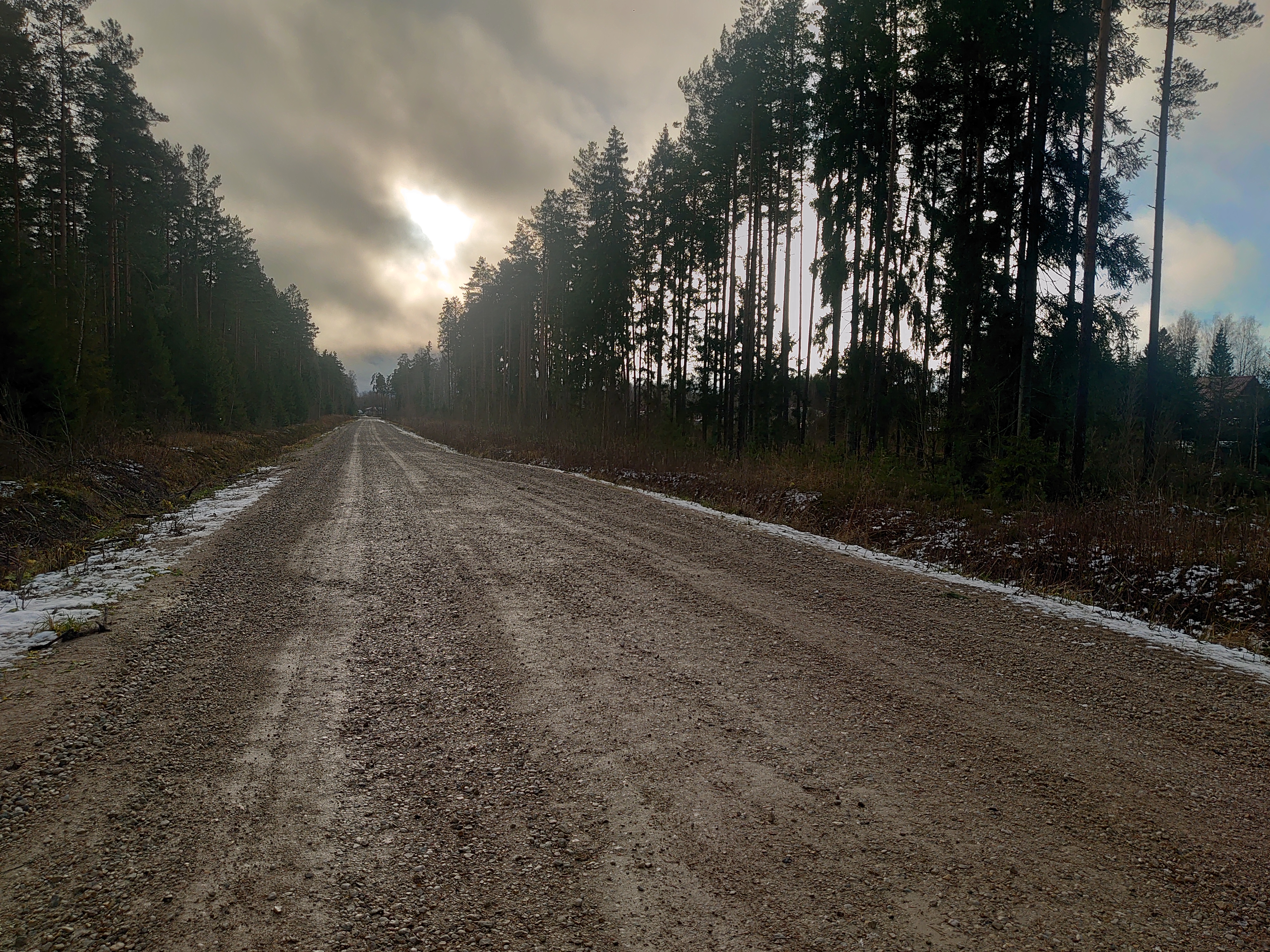 Täna oli suur osa purukruusast tee äärde kuni kraavinõlvadeni lükatud ja teed oli täidetud jämedama fraktsooniga, mis oli tee sisse sõidetud.