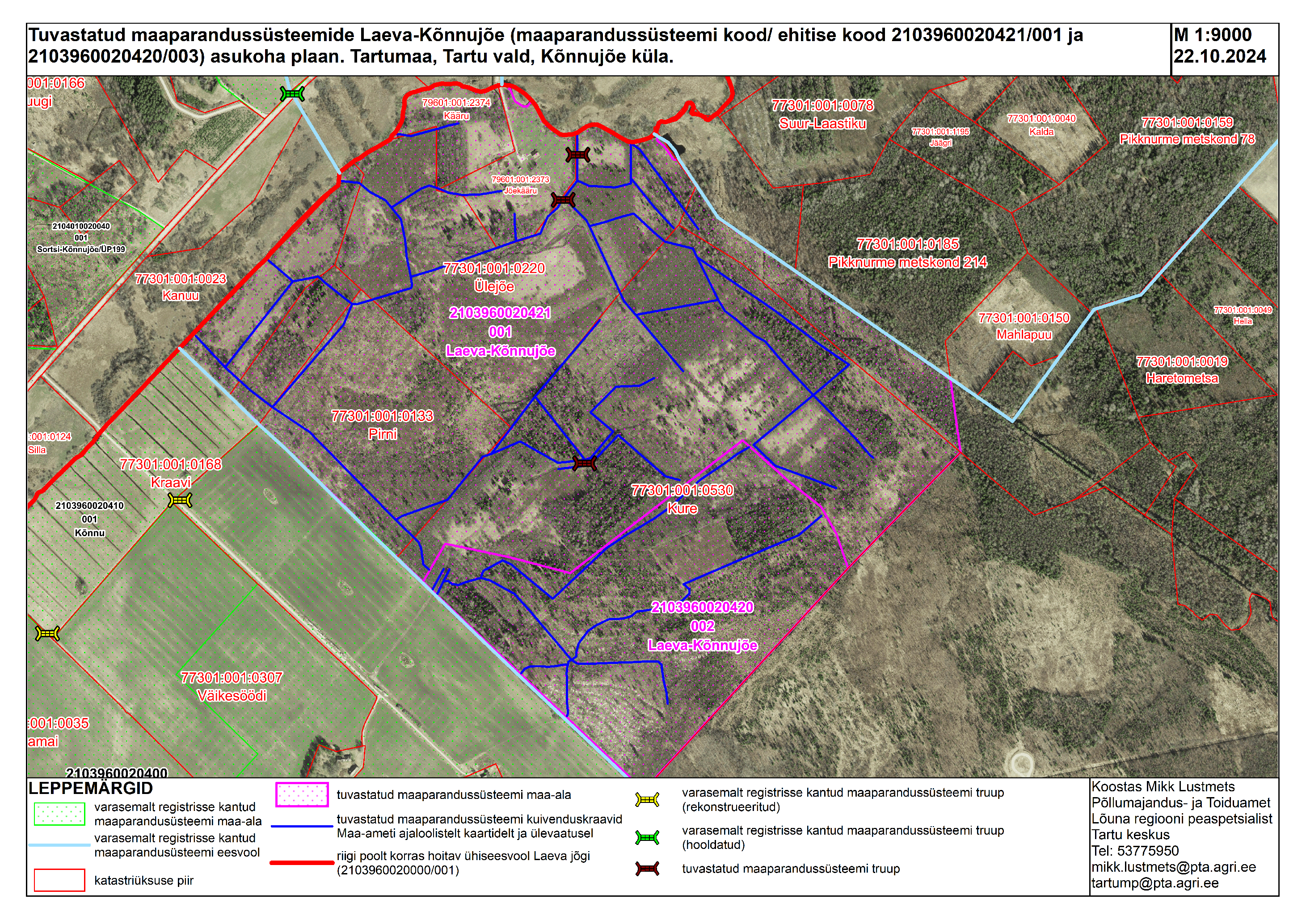 Meie: 19.09.2024 nr 6.1-5/25729-2 Lugupeetud maaomanik TORNATOR EESTI OÜ (registrikood 10013860) esitas 14.06.2024 taotluse olemasoleva maaparandussüsteemi arvele võtmiseks Tartumaal Tartu vallas Kõnnujõe külas Kure (katastritunnus 77301:001:0530) ja Pirni (katastritunnus 77301:001:0133) katastriüksustel. Oleme tutvunud kaardimaterjaliga ETAK-s, Maa-ame ajalooliste kaardega ja tuvastanud maaparandussüsteemi rajased teie kinnistul. Anname teada, et Põllumajandus- ja Toiduame (PTA) ametnik teostab kuupäevadel vahemikul 07.10 - 06.12.2024 maaparandusseaduse (MaaParS) §99 lõike 10 alusel kinnistutel ülevaatuse MaaParS §99 lõike 2 ja 5 nimetatud hinnangu andmiseks maaparandussüsteemi (MPS) seisukorrale. Juhul kui tuvastatud MPS vastab MaaParS §99 lõikes 2 nimetatud seisukorrale, kantakse MPS maaparandussüsteemide registrisse ja loetakse kasutusluba antuks. Tuvastatud maaparandussüsteemile jäävad katastriüksused: