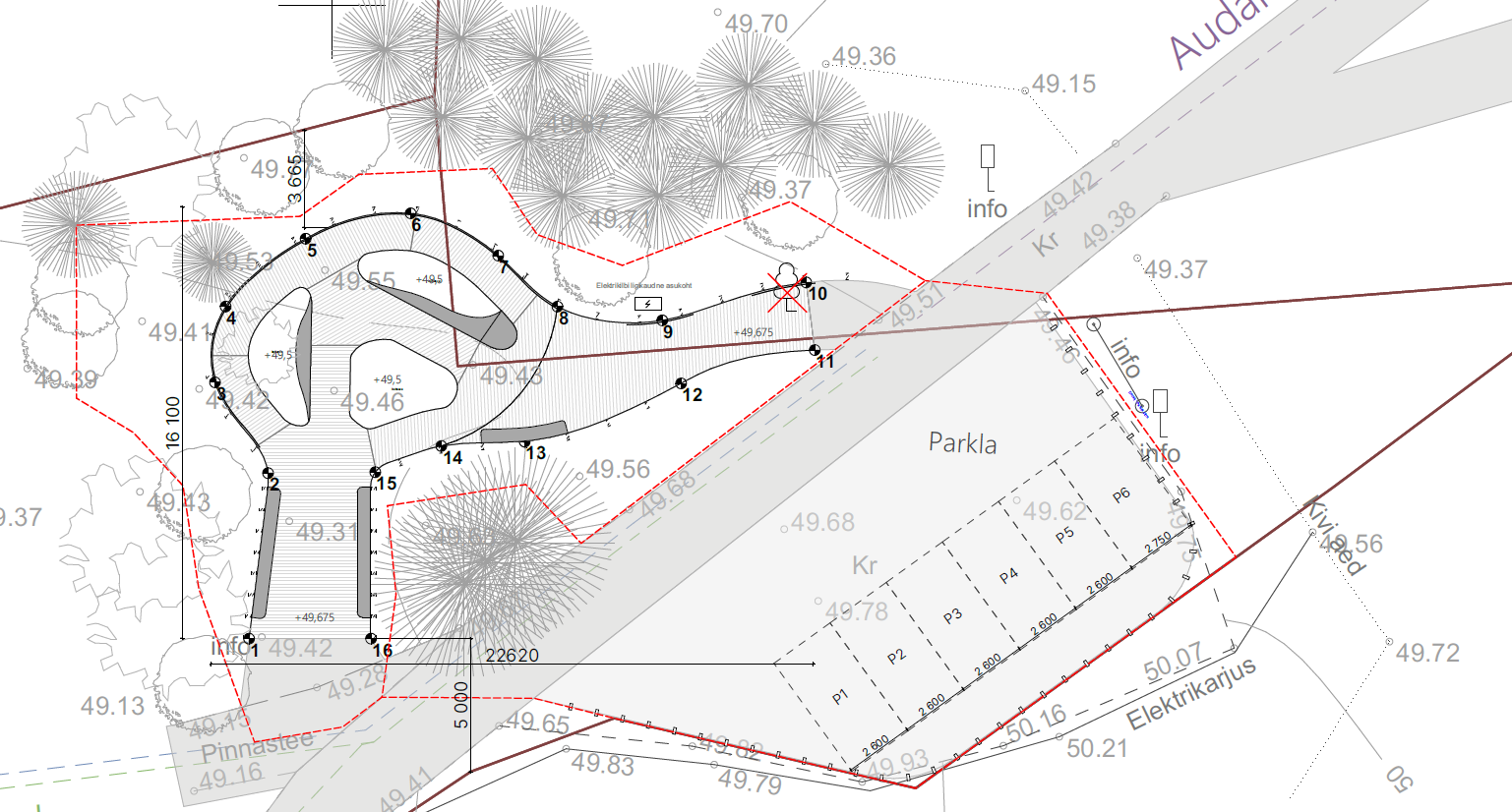 Tere Elektrilevi OÜ poolt on projekteerimisel Kihelkonna metskond 68 kinnistu (Viidu küla Saaremaa vald) Viidumäe LKA väliekspositsioon elektrivõrguga liitumine. Liitujaks on RMK. Planeeritavate tööde käigus rajatakse Keskuse kinnistul olevast Audaku alajaamast uus maakaabelliin Kihelkonna metskond 68 kinnistule paigaldatava liitumiskilbini. Täna on Keskuse kinnistu Kliimaministeeriumi valitsemisel. Saadud Info põhjal saab uueks omanikuks tulevikus Saaremaa vallavalitsus. Kliimaministeerium saab kooskõlastada eskiisi joonise peale seda, kui trass on kooskõlastatud eelnevalt Saaremaa vallaga. Enne geoaluse tellimist oleks vaja täpsustada just Keskuse kinnistule paigaldatavat kaablitrassi. Seal on praegu olemasolevad 0,4 kV kaablid väikse ristlõikega ja liitumiseks tuleb paigaldada suurem kaabel. Planeeritav trass eskiisil on näidatud lilla katkendliku joonega (paigaldus olemasoleva kaabli kõrvale). Keskuse juurde mineva tee kõrval jääks planeeritav kaablitrass puudest vasakule (puude ja kraavi vahele). Kruusatee ääres on kohe suured puud.