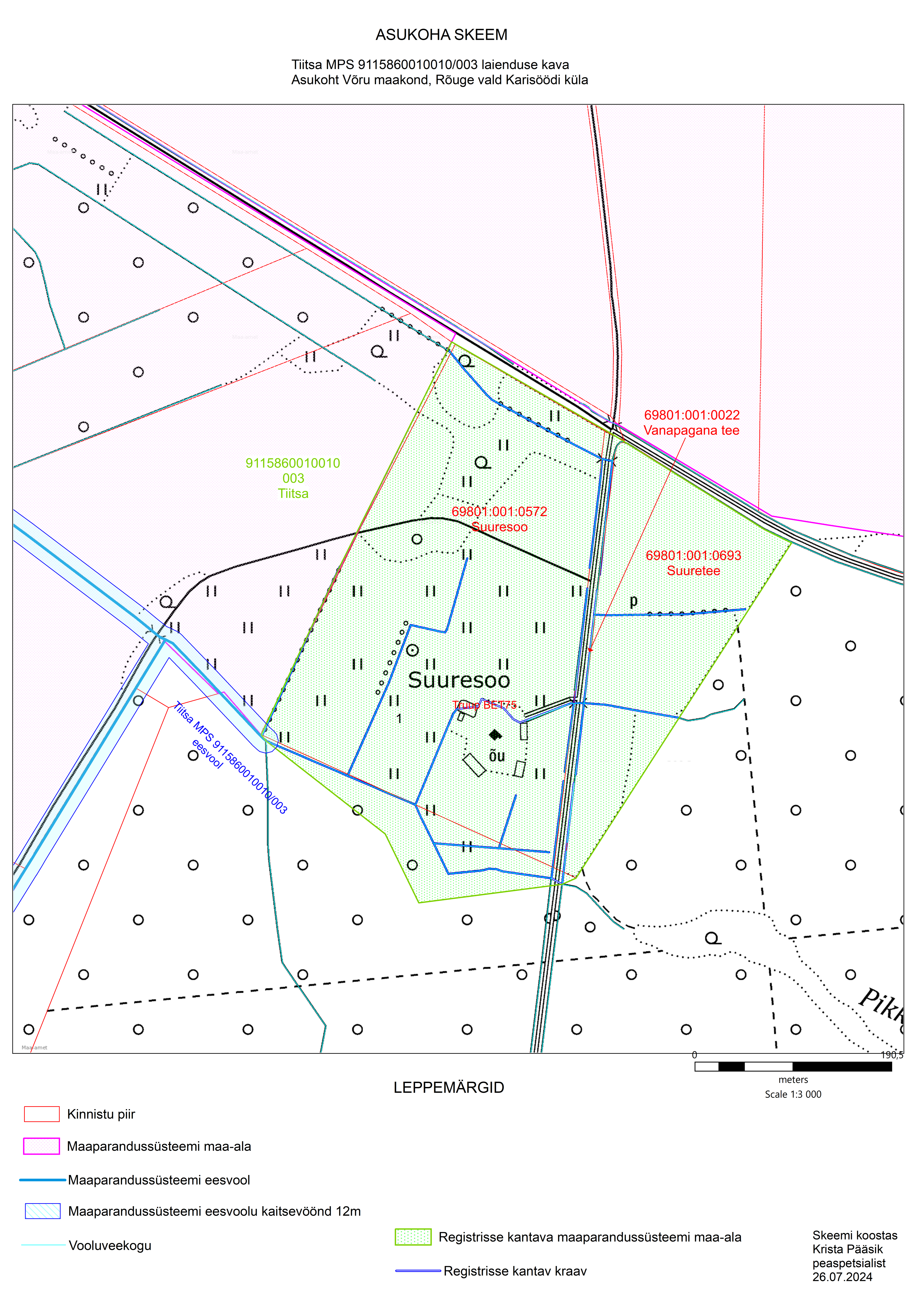 Maa-amet on esitanud 03.07.2024 taotluse Võru maakonnas Rõuge vallas Karisöödi külas asuva Suuretee (69801:001:0693) katastriüksuse kraavide ja maa-ala maaparandussüsteemide registrisse (MSR) kandmiseks. Saadan kooskõlastamiseks asuva Tiitsa MPS 9115860010010/003 laiendamise kava.