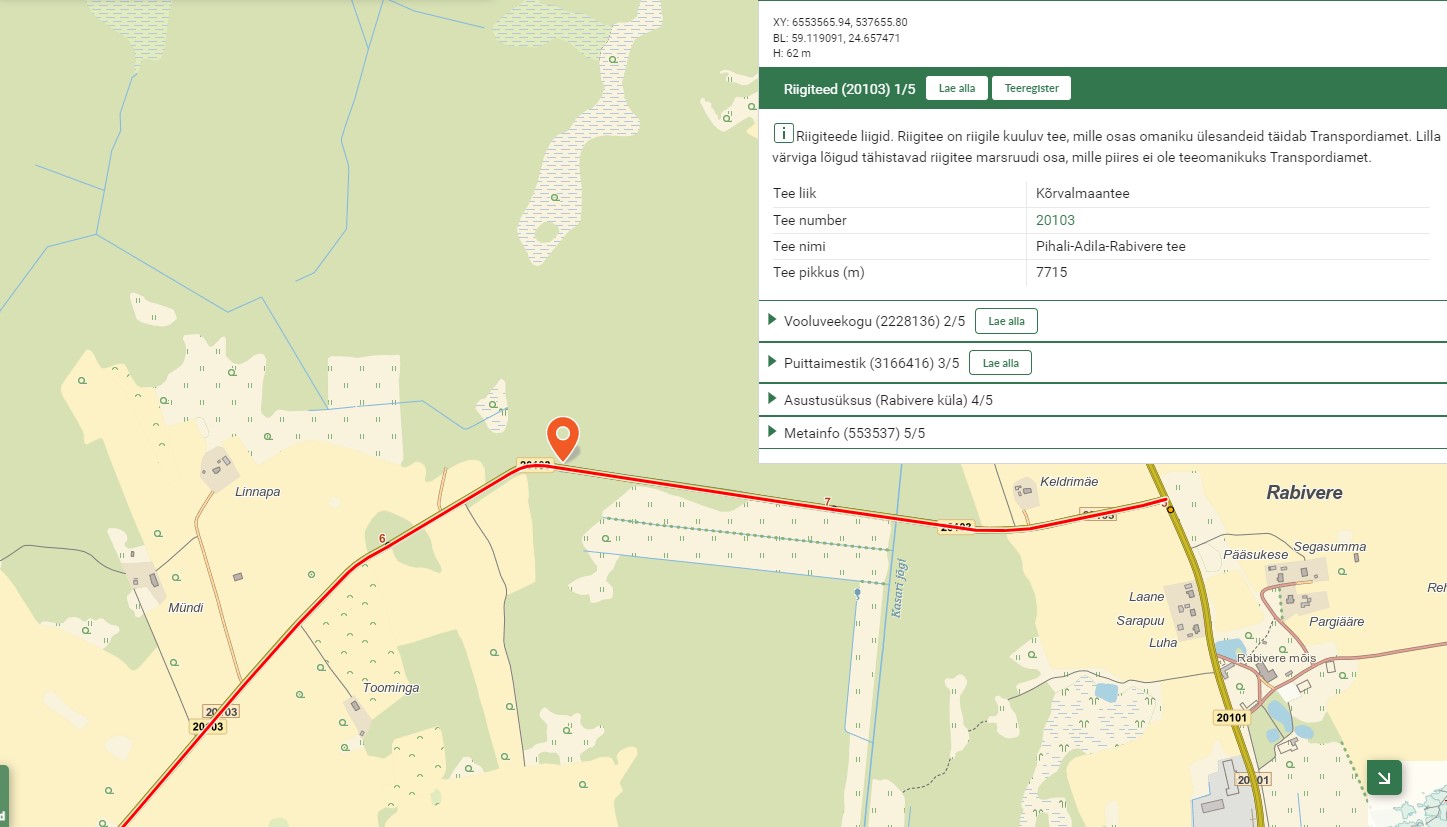 Riigitee (nr, nimi, alg ja lõpp km); vasak/parem tee pool