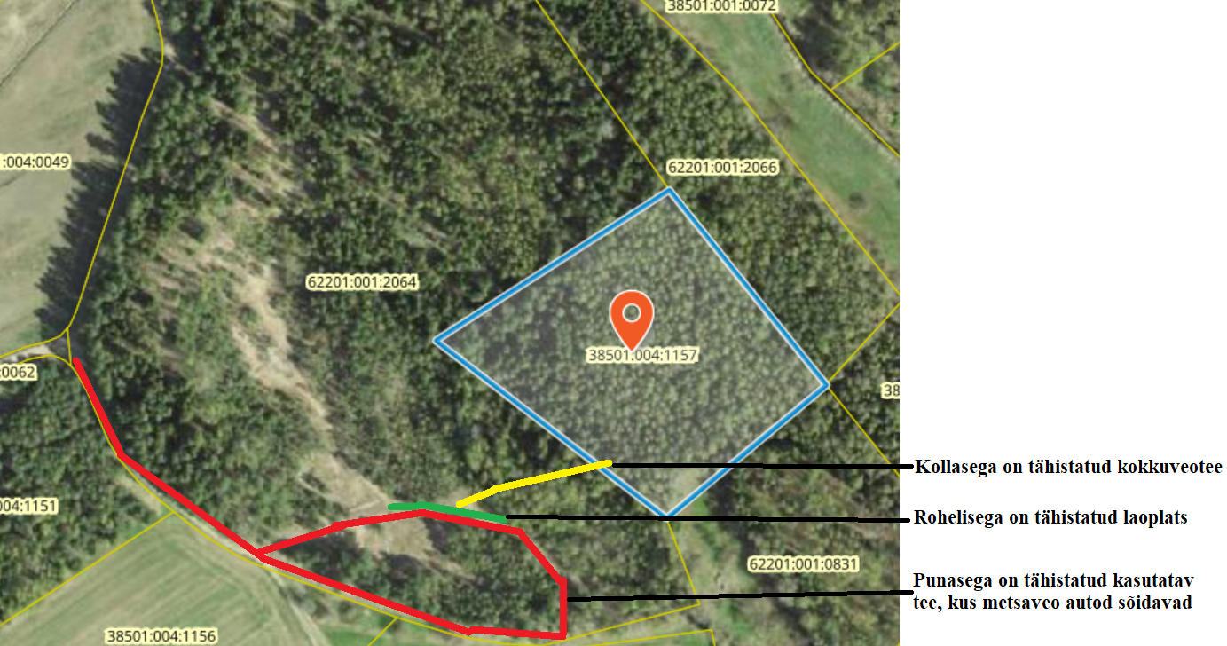 Tere! Kirjutan seoses ühe maakasutuse sooviavaldusega, mida RMK äpis süsteem teha ei lasknud. Estonian Sustainable Forestry soovib raiet teostada Marimäemetsa 38501:004:1157 kinnistul, Põlva vallas, Joosu külas. Materjali kokkuveoks ja ladustamiseks sooviksime kasutada Marimäe liivakarjäär -i 62201:001:2064 kinnistut, mille puhul oleks materjali kokkuvedu kõige lühem ning ladustamine ja transport kõige lihtsam. Skeem on kirja manuses. Ladustamiseks kasutaks vana karjääri ala, laoplatsi alal kasvab mõningast remmelga võsa, mis tuleks eemaldada. Kokkuveotee laoplatsist Marimäemetsa kinnistule tuleks mööda kvartal PW192 62201:001:2064 eraldis 8 äärest, kus kulgeb ka kohati vana siht või lihtsalt looduslikult puudest tühi koridori laadne asi. Kokkuveotee osal mis kulgeks Marimäe Liivakarjääri kinnistul tuleks kokkuveo teosatmiseks raiuda ca kümmekond peenemat puud ning kohati remmelga võsa. Kokkuveotee laius oleks 4m. Laoplatsist metsamaterjali transpordiks saab kasutada karjääri alale minevat kruusateed mille olukord on rahuldav. Veoautodega saaks sõita karjääri alal ka ringtee süsteemis, laoplatsi juurest tuleks selleks eemaldada teele kaldu olevat remmelga võsa. Laoplatsi, kokku ja väljaveotee skeem on kirja manuses. Materjali kogus, mida soovime Marimäemetsa kinnistult raiuda oleks ca 650tm. Raiet sooviksime teha suve perioodil kuiva ilmaga, et kahjustada minimaalselt pinnast. Raie ning materjali transpordi periood võiks olla 11.07 – 30.08.2024. Soovin tagasisidet antud plaani osas. Lisaküsimuste korral helistada +372 55516343 Mario Mihkelson või esitada e-mailitsi.