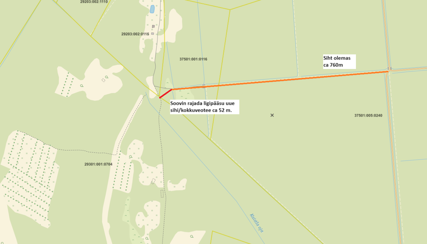 Tere Olen Jarro Mihkelson Multiland Oü s. Multilandil on kinnistu Raplamaal Kehtna vallas Kõrbja külas, Ojalaane 29301:001:0704. Kinnistu ise ca 100 ha kuid ligipääs keeruline. Olen kohapeal erinevaid võimalusi hinnanud ja suhelnud naabritega kuid pole kuskile jõudnud. Sellest tulenevalt uurin nüüd RMK kaudu lähenemist, manuses ka joonis. Ligipääsuks RMK kaudu on juba 760m sihti olemas kuid viimane ca 50 m oleks vaja uus siht rajada ca 5-6m lai. Hetkel kasvab seal ca 15-18 tm puitu peal, kuusk, kask ja hall-lepp. Viimase 50m jõuab Ojalaane kinnistuni kus saame juba enda kinnistu piires toimetada. Kogu töö mis jääb RMK peale saame ise ära teha ja tekkiva materjali võime ära osta. Ligipääs saaks olema kasutatav kuiva ja külmaga, otsest tee ehitust plaanis pole. Kuidas ja mis tingimustel saame antud ideed rakendada? Võime kohapeal kokku saada ja asja arutada. Jarro Mihkelson Metsameister Multiland OÜ, Multiland Management OÜ [email protected] +372 50 90 554 Riia 142, 50411 Tartu multiland.ee