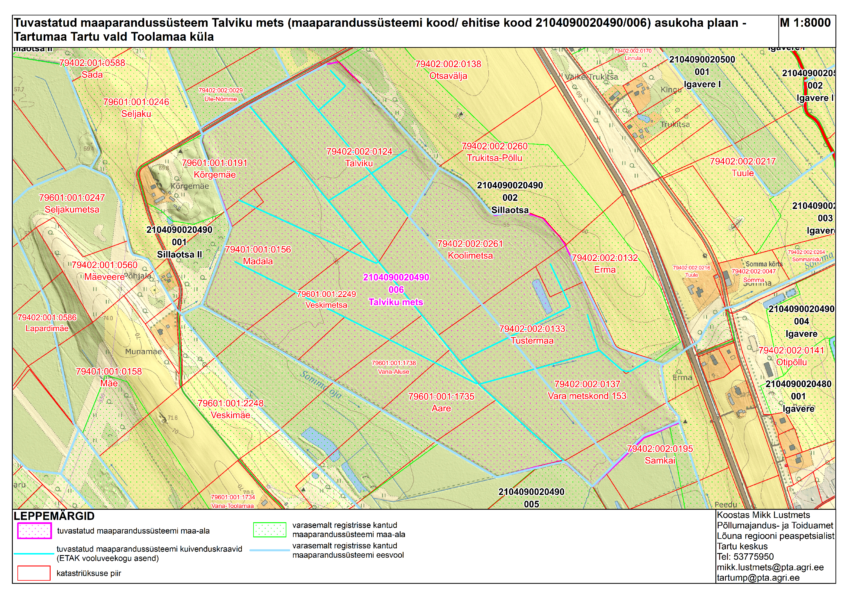 Meie: 6.1-5/7958-1 Lugupeetud maaomanik SAARNIIDU OÜ (registrikood 12198332) esitas 13.02.2024 taotluse olemasoleva maaparandussüsteemi arvele võtmiseks Tartumaal Tartu vallas Toolamaa külas Talviku (katastritunnus 79402:002:0124) katastriüksusel. Oleme tutvunud kaardimaterjaliga ETAK-s ja oleme tuvastanud maaparandussüsteemi rajased teie kinnistul. Anname teada, et Põllumajandus- ja Toiduame (PTA) ametnik teostab kuupäevadel vahemikul 08.04-26.04.2024 maaparandusseaduse (MaaParS) §99 lõike 10 alusel kinnistutel ülevaatuse MaaParS §99 lõike 2 ja 5 nimetatud hinnangu andmiseks maaparandussüsteemi (MPS) seisukorrale. Juhul kui tuvastatud MPS vastab MaaParS §99 lõikes 2 nimetatud seisukorrale, kantakse MPS maaparandussüsteemide registrisse ja loetakse kasutusluba antuks. Tervikliku maaparandussüsteemi moodustavad maa-alad (ja kuivenduskraavid) järgnevatel katastriüksustel: