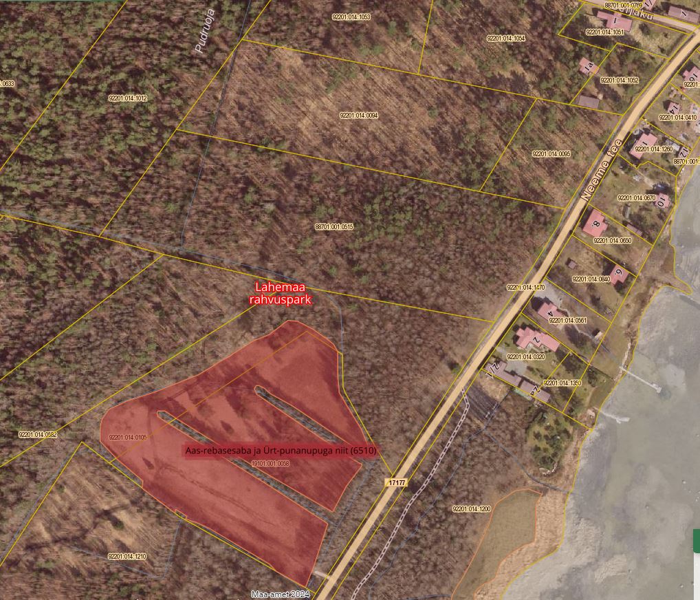 Keskkonnaameti inspektorid tuvastasid järelevalve käigus, et Lahemaa rahvuspargis Lääne-Virumaal Haljala vallas Käsmu külas Sagadi metskond 309 maaüksuse (k.t 19101:001:0058) loodusliku rohumaa kõlvikule on ladustatud metsamaterjali. Rohumaale on tekkinud jäljed, mis kulgevad ka läbi Sagadi metskond 109 maaüksuse (k.t 92201:014:0105) kirdesse ning seejärel mööda Pudruoja kraavi äärt läbi Sagadi metskond 289 maaüksuse (k.t 88701:001:0515). Jäljed jõuavad Metsa maaüksusele (k.t 92201:014:0094), kus on tehtud hiljuti raiet. Sagadi metskond 309 ja 109 rohumaad on kasutatud ka varasemalt ning varasemad jäljed on näha selgelt 17.04.2023 Maa-ameti ortofotol. Sagadi metskond 309 ja 109 loodusliku rohumaa kõlvikule on registreeritud poollooduslik kooslus nimega Aas-rebasesaba ja Ürt-punanupuga niit (6510). Lahemaa Rahvuspargi kaitse-eeskirja § 1 p 2 kohaselt on Lahemaa rahvuspargi üks kaitse-eesmärkidest kaitsta ka loodusdirektiivi elupaigatüüpe, mille hulka kuulub teiste hulgas elupaigatüüp nr 6510.