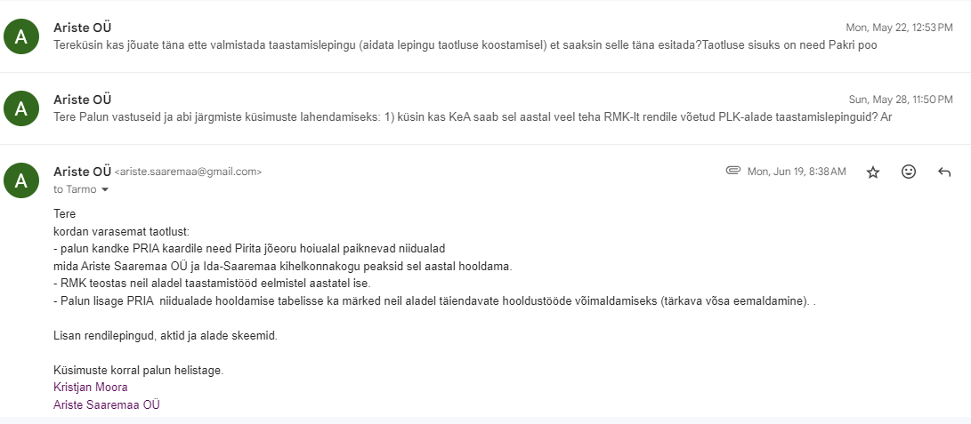 Kujunenud olukorras pakun RMK-le võimalust lõpetada Pirita jõe hoiualal olevate maaüksuste rendilepingud Ariste Saremaa OÜ ja MTÜ Ida-Saaremaa kihelkonnakoguga ning võtta need maaüksused hooldamisele RMK poolt.