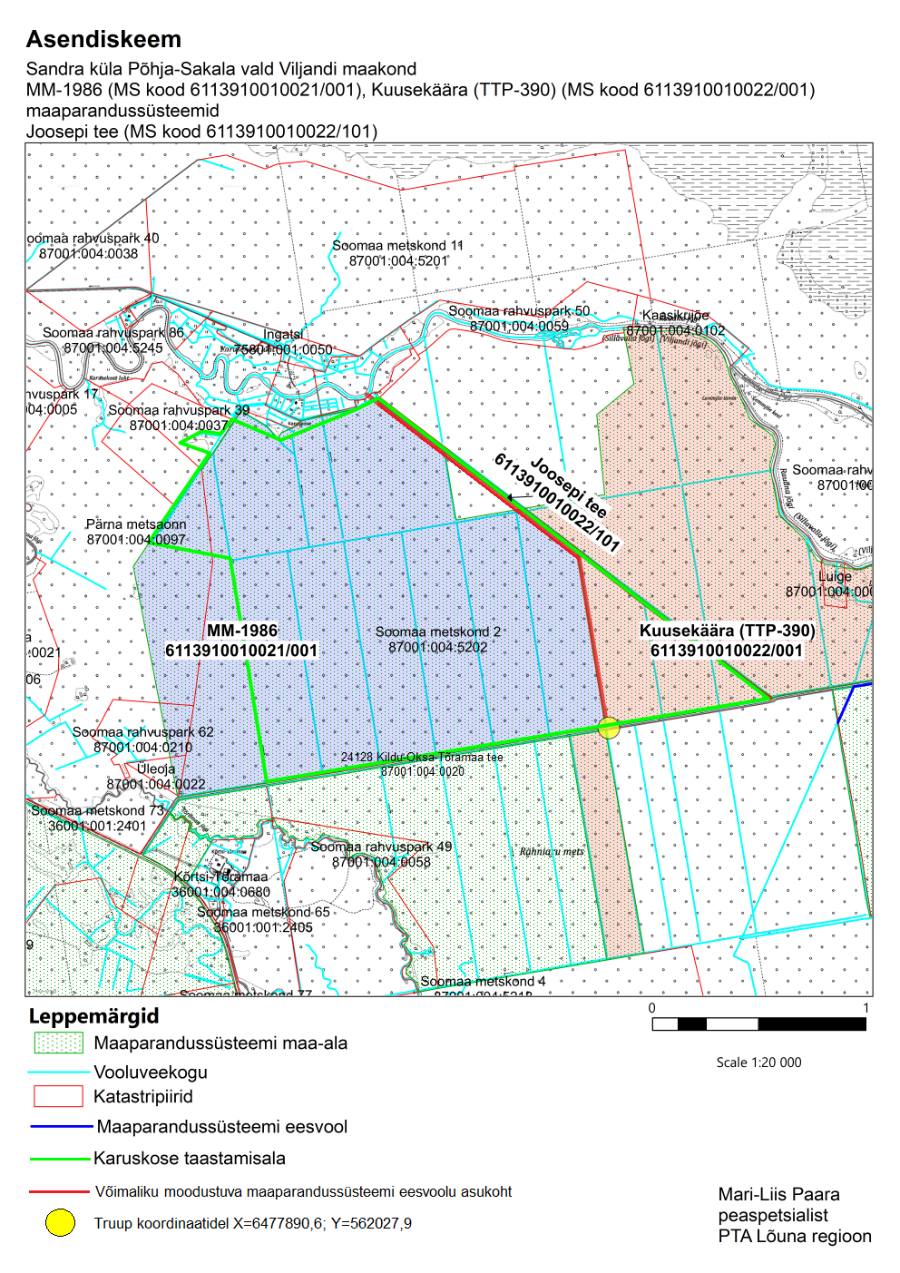 PTA on tutvunud RMK poolt esitatud Karuskose taastamisala kuivenduskraavide likvideerimise kavatsusega. Kavandatav tegevus asub Viljandi maakonnas Põhja-Sakala vallas Sandra külas valdavalt Soomaa metskond 2 (87001:004:5202) katastriüksusel ning osaliselt Pärna metsaonn (87001:004:0097), Soomaa rahvuspark 52 (87001:004:0282) ja Soomaa rahvuspark 39 (87001:004:0037) katastriüksustel. Kavatsusala järgi hõlmab taastamisala MM 1986 (MS kood 6113910010021/001) ja osaliselt Kuusekäära (TTP-390) (MS kood 6113910010022/001) maaparandussüsteemi maa-alasid. Taastamisala piirneb osaliselt maaparandussüsteeme teenindava Joosepi teega (MS kood 6113910010022/101). Taastamisalast ja 24128 Kildu-Oksa-Tõramaa teest lõunapoole jääb Kuusekäära (TTP-390) maaparandussüsteemi osa, mida teenindab taastamisala läbiv kuivenduskraav (asendiskeemil märgitud punasega).