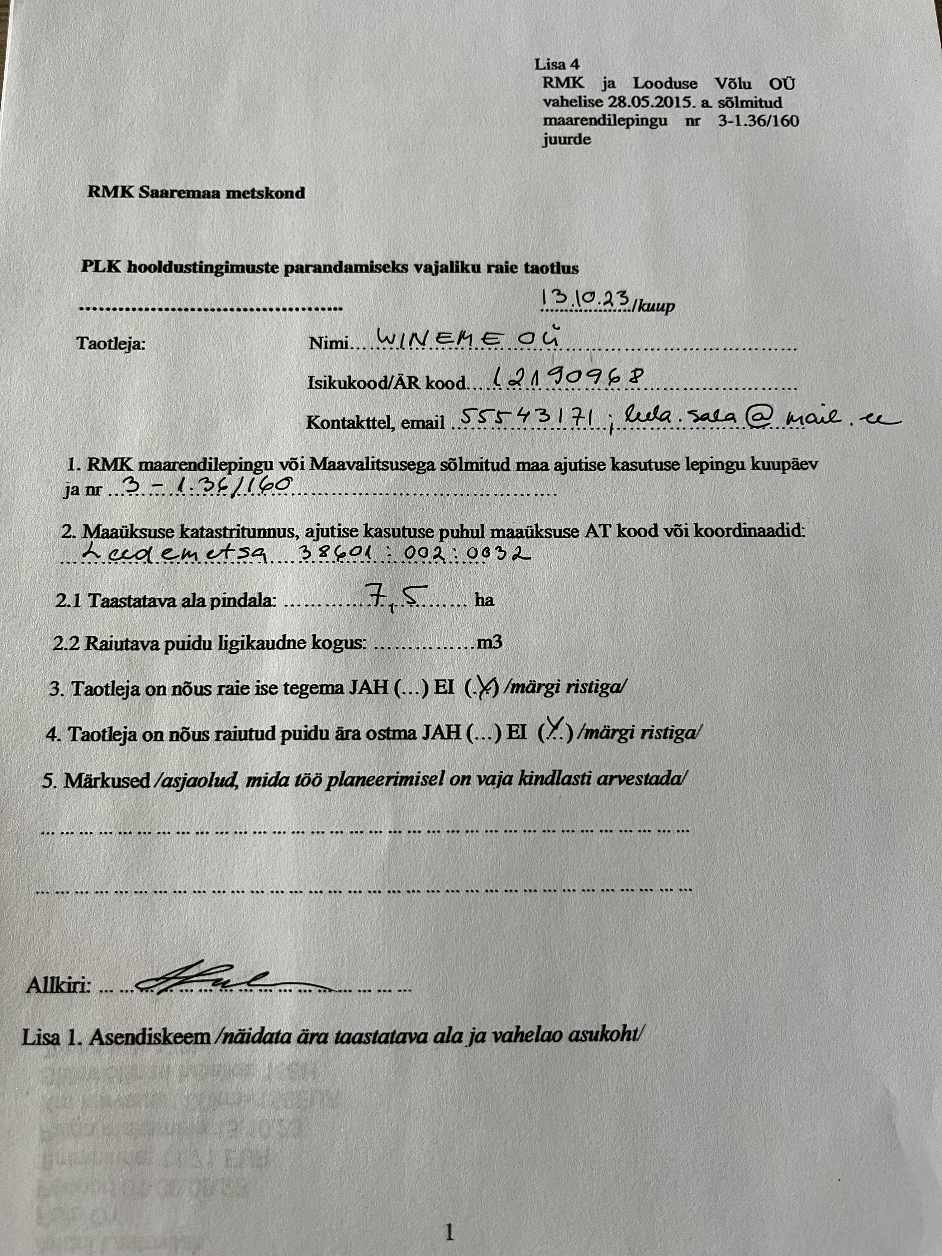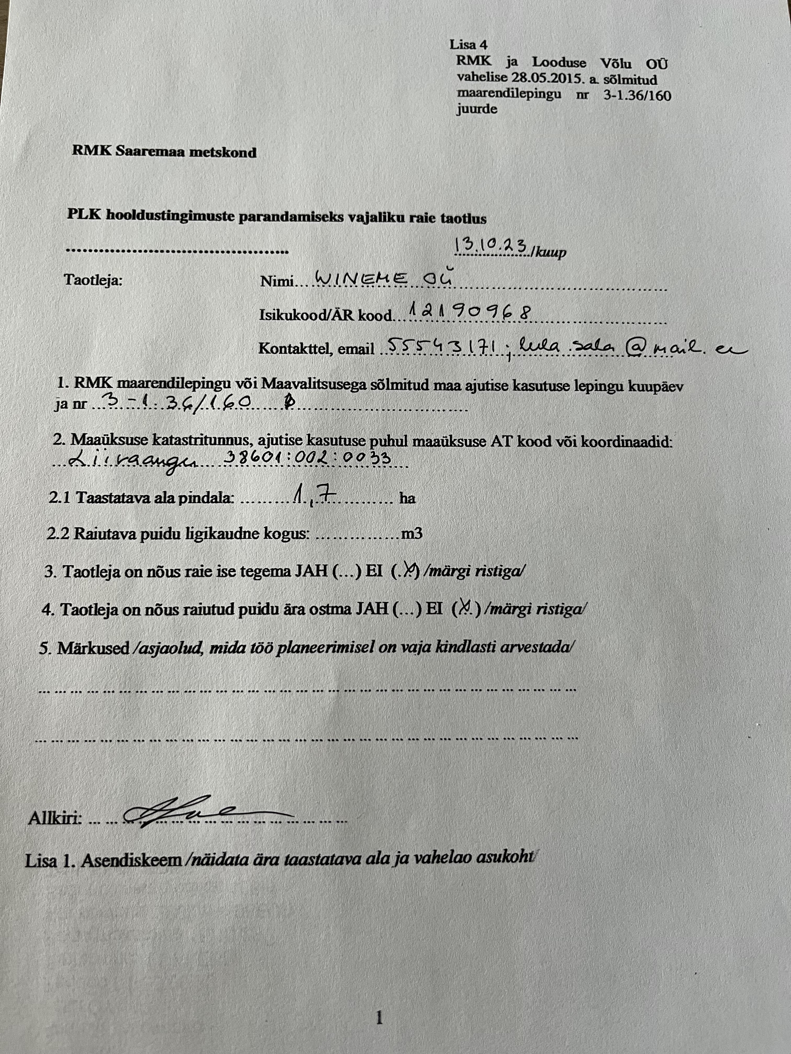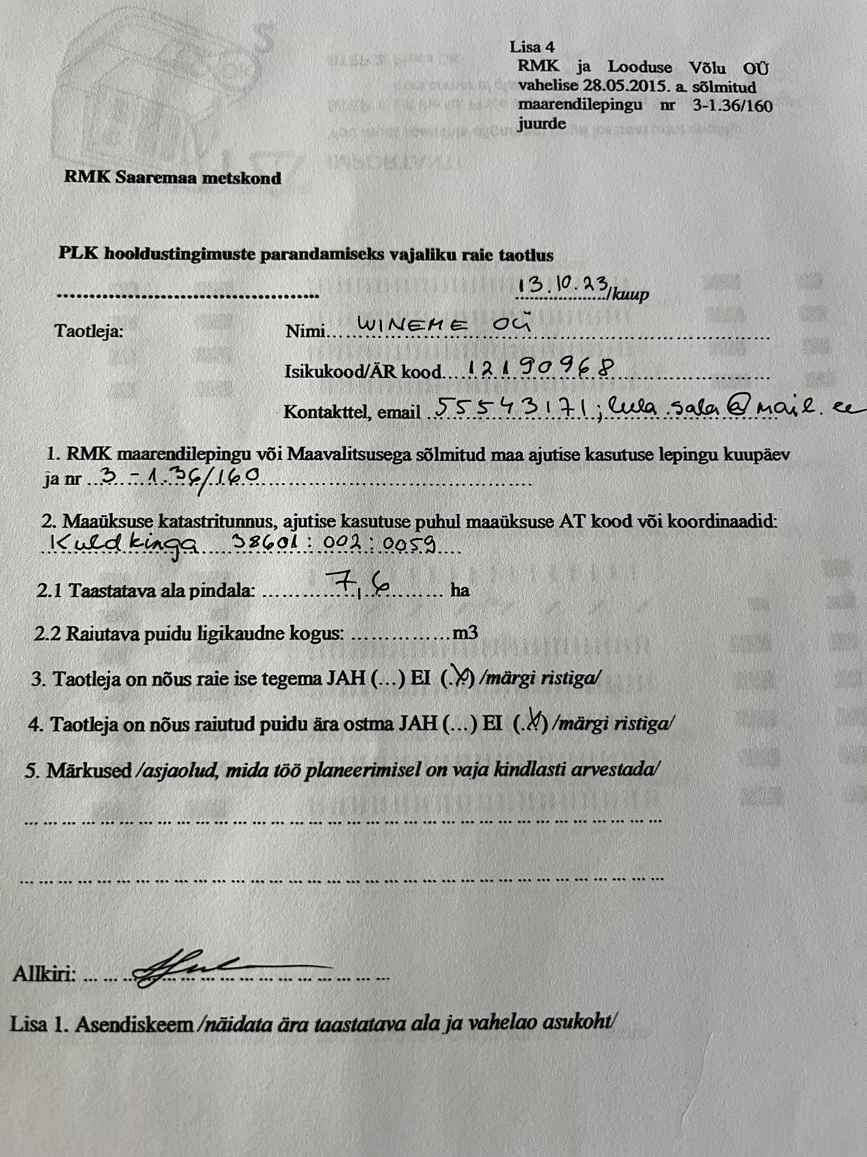 RMK paraku ei saa seda tööd kavandada ilma rentniku esitatud raietaotluseta. Raietaotluse vorm on