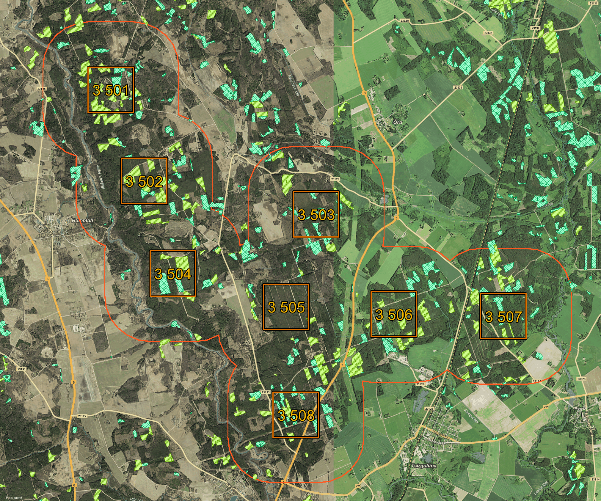 Kaamerad paigaldame metsaaladele juhuslikult valitud asukohtadesse, kuid teede ja matkaradade vahetusse lähedusse ja/või suunatuna neile me kaameraid ei paigalda. Kõikide kaamerate vaatevälja keskele paigaldatakse kaamerast 5 m, 10 m ja 15 m kaugusele ca 80 cm kõrgused puidust märgised. Lisan kirjale seireala kaardi, millel on märgitud kaheksa hirvlaste pabulaloendusteks kasutatavat seiremarsruu koos puhveralaga. Sellesse piirkonda me kaamerad paigaldamegi. Antud piirkonnas kogusime me sama metoodikaga seireinfot ka möödunud 2022 sügise.