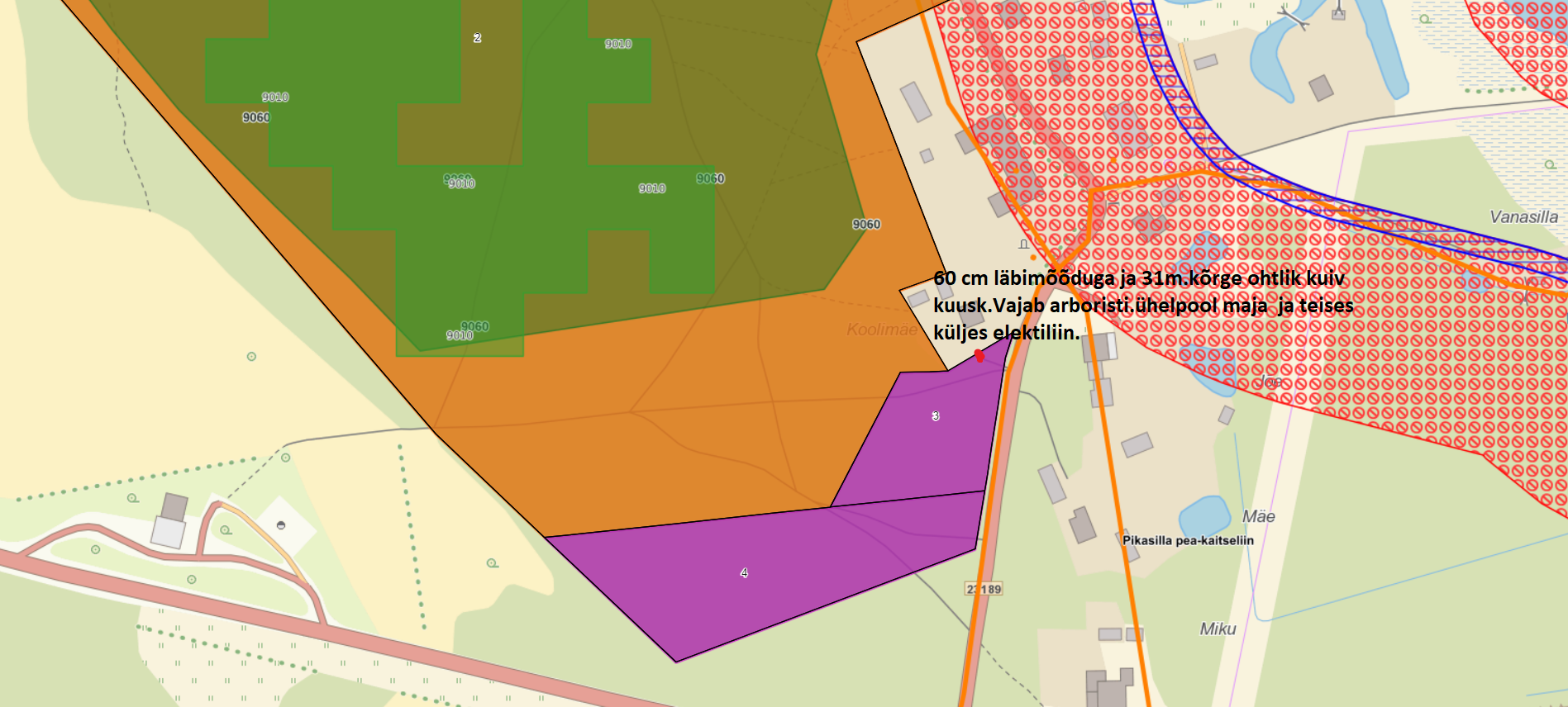 Esitasite Keskkonnaametile taotluse ohtlike puude raieks Aakre metskond 21 ja Aakre metskond 3302 katastriüksustel. Kokku soovitakse eemaldada seitse puud (kolm kuiva mändi,
