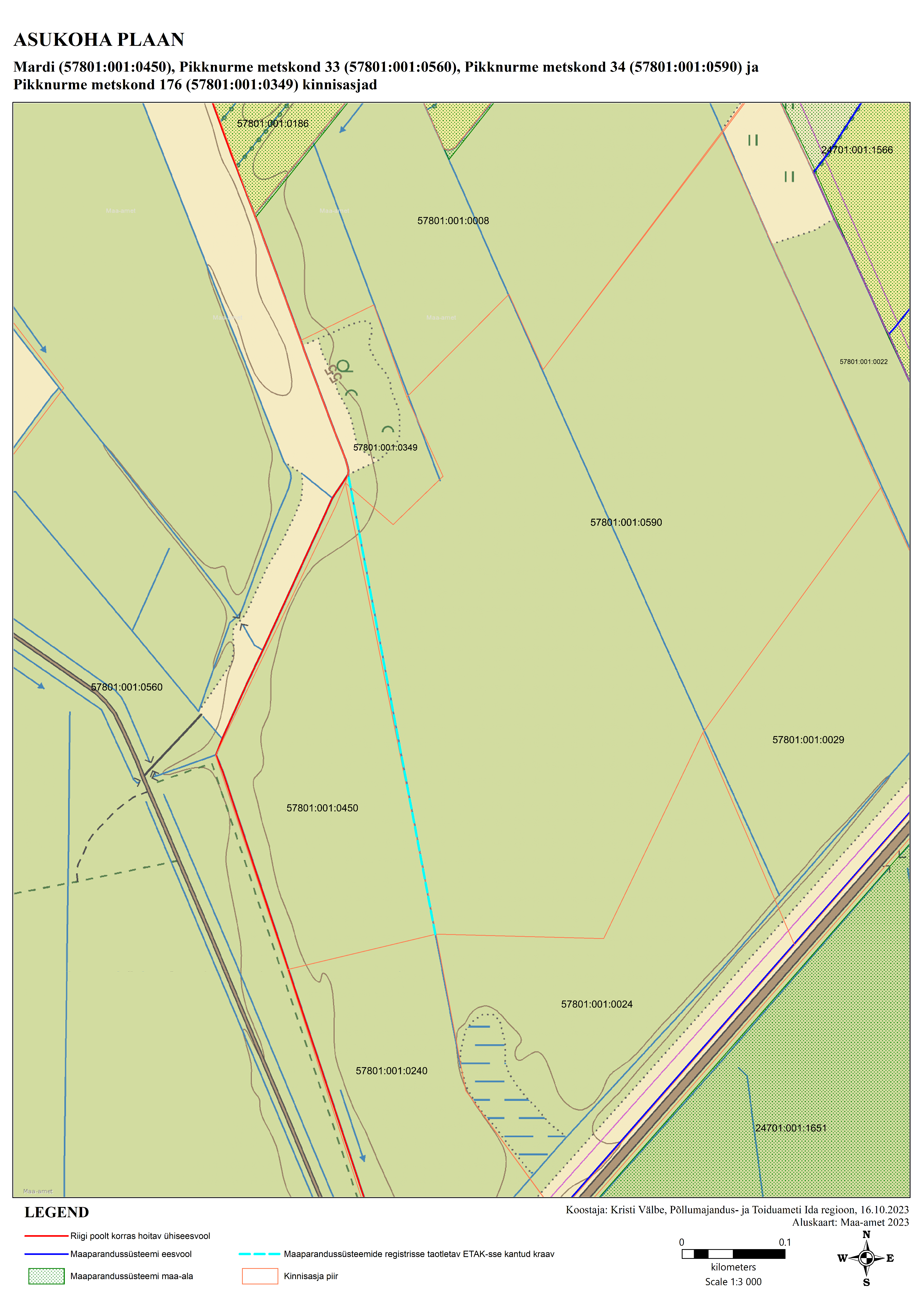 metskond 33 (57801:001:0560), Pikknurme metskond 34 (57801:001:0590) ja Pikknurme metskond 176 (57801:001:0349) kinnisasjadel ja suubub kaardimaterjali alusel riigi poolt korras hoitavasse ühiseesvoolu Laeva jõgi (maaparandussüsteemi/ehitise kood 2103960020000/001). Anname teada, et Põllumajandus- ja Toiduamet planeerib 17.10.2023 viia läbi eelnimetatud kinnisasjadel kohapealse kontrolli, mille tulemusena antakse hinnang taotletava registrisse kantava maaparandussüsteemi seisukorra kohta. Kui kohapealse kontrolli tulemusena selgub, et nimetatud kraavi/maaparandussüsteemi on võimalik nõuetele vastavaks viia maaparandushoiutöödega, siis tehakse maaparandussüsteemide registrisse kanne, millega loetakse maaparandusseaduse § 99 lõike 1 alusel kasutusluba maaparandussüsteemile antuks. Sellest teavitatakse Teid eraldi kirjaga. Lugupidamisega Kristi Välbe Peaspetsialist-koordinaator Ida regiooni Jõgeva esindus Põllumajandus- ja Toiduamet _____________________________ [email protected] +372 524 5978 / 4627 Suur 3 / Jõgeva, Jõgevamaa 48306 / https://pta.agri.ee/