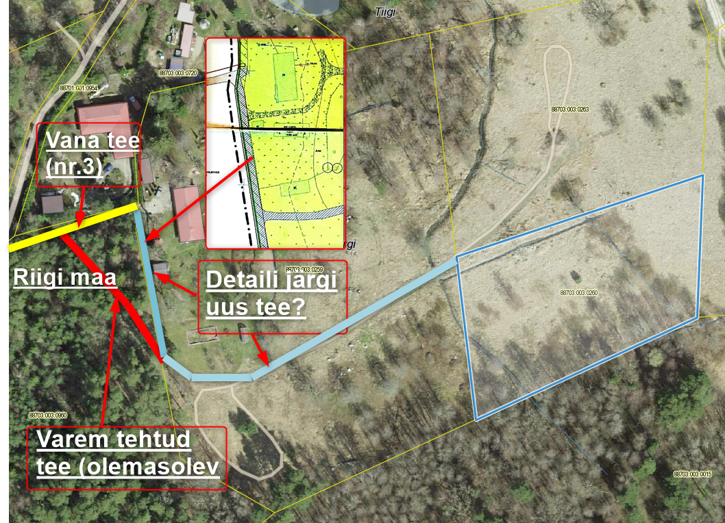 Tere! Tegelen Põõsaste kinnistu müügiga Toolse külas 88703:003:0260 Seni kasutatud juurdepääsutee läbib riigi maad 88703:003:0960. Küsimus, kas olemasolevat teed, mis läbib riigi maad tohib parendada (killusku täidet lisada)? Kas on võimalik ka Põõsaste kinnistu kasuks servituut seada või on veel mõni hea lahendus, et kinnistu omanik pääseks pingevabalt oma maale? Lisan ka joonise. Tänan! Parimat! Liitu Uus Maa uudiskirjaga!