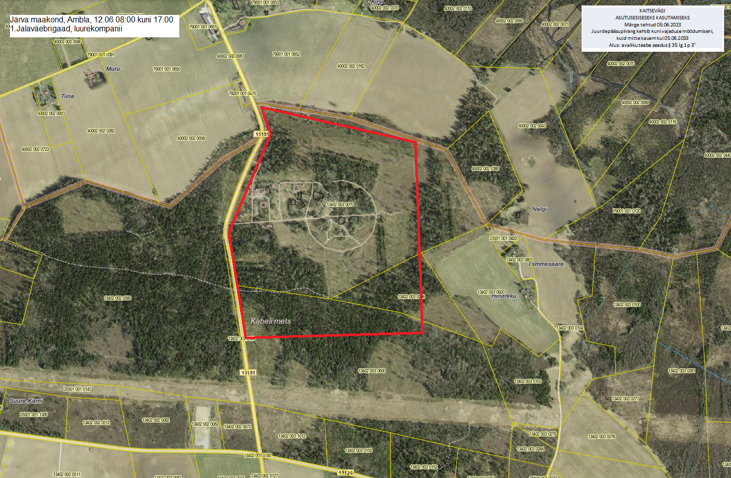 1. Käesolevaga soovime kooskõlastust väljaõppeüritusele: vastutav üksus: Kaitsevägi, Diviis, 1. jalaväebrigaad, luurekompanii aeg: 12.06.2023 | 08:00 - 17:00 väljaõppeala: AMBLA asukoht: AMBLA 2. Kavandatava õppuse või harjutuse asukoht on lisatud skeemil (vt Lisa). 3. Õppusel või harjutusel osaleb 75 inimest. 4. Õppusel või harjutusel kavandatava tegevuse kirjeldus: takkaharjutus; 5. Kasutatavad mootorsõidukid: Maastur - 10 tk;