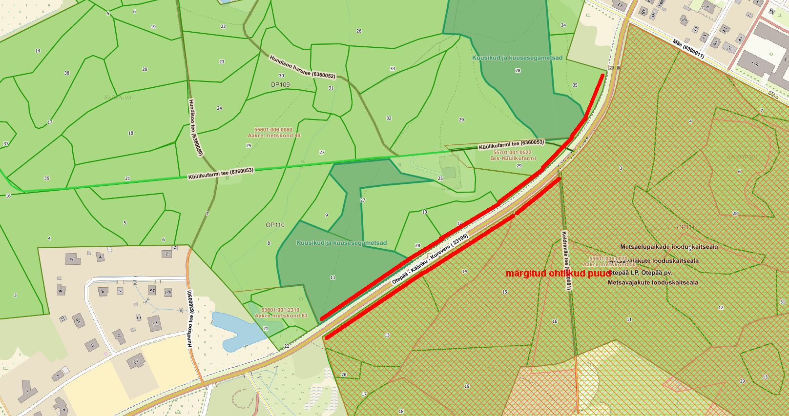 - 22 kuivanud kuuske OP110-11 VEP (vääriselupaik, kaitsealuse liigi leiukoht)