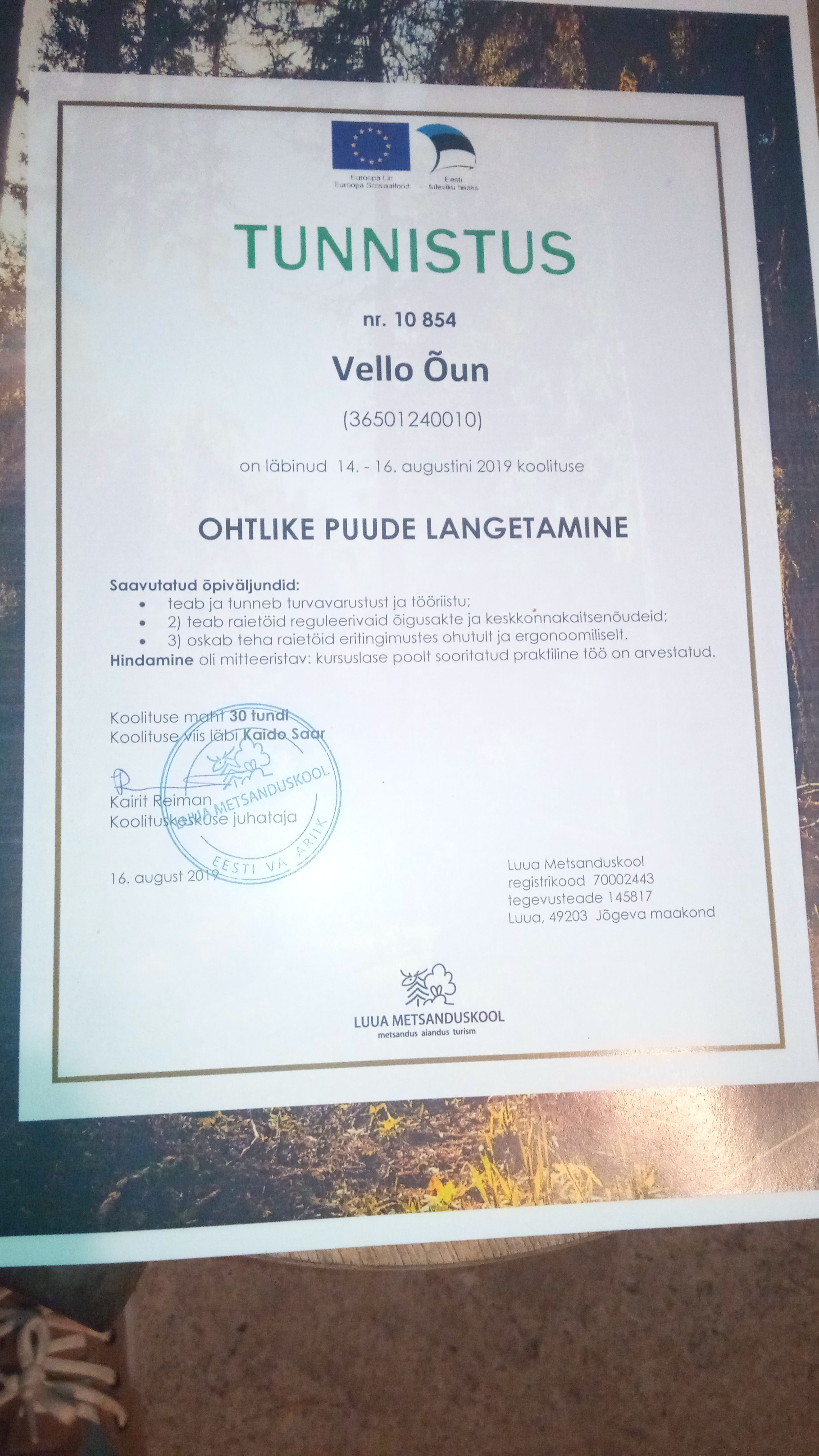 Õppepuhkusele lubamine Vastavalt Täiskasvanute koolituse seaduse paragrahv 13 lõige 1 l u b a n RMK metsakasvatustalituse Edela piirkonna raietöölise Vello Õuna õppepuhkusele 3 kalendripäevaks 14.-16.08.2019. Alus: 1) Vello Õuna 30.08.2019 avaldus. 2) Luua Metsanduskooli 30.08.2018 tõend. (allkirjastatud digitaalselt)