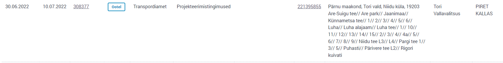 | Pärnu maakond, Põhja-Pärnumaa vald, Enge küla, Loogi kinnistu Telia sideühendus | 12.10.2022 | 536 | 7.1-2/22/21558-2 | Valjaminev kiri | transpordiamet | Kirjanurk OÜ |