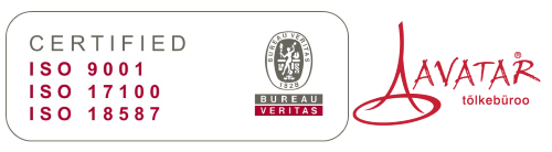 Tõlkebürool Avatar on tõlketeenuste standardi ISO 17100, masintõlke toimetamise standardi ISO 18587 ja kvaliteedijuhtimissüsteemi standardi ISO 9001 sertifikaadid.