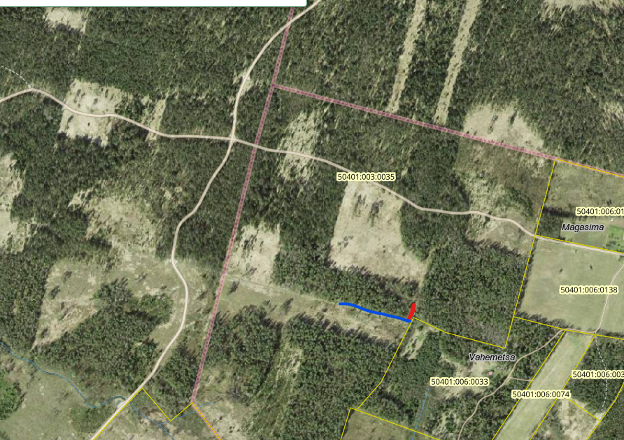 Tere! Soovime RMK maal registreeritud söödaplatsi (kaardil punane täpp) juurde paigaldada jahikantsli. Orienteeruvalt sinise joone trajektoorile metsapoole tee äärde. Seal on lagedam ala olemas, kuhu see looduses mahub. Vajalik on maha võtta sarapuu võsa, puid ette ei jää. Pukk on ratastel, st käru peal ja võimalik RMK töödele ette jäämisel eest viia. Puki peale paigaldame siis ka vajaliku kaameravalve sildi. Kinnistu nr 50401:003:0035. Kas võime puki antud asukohta viia? Head uue aasta algust Helari Buht Vardi JS