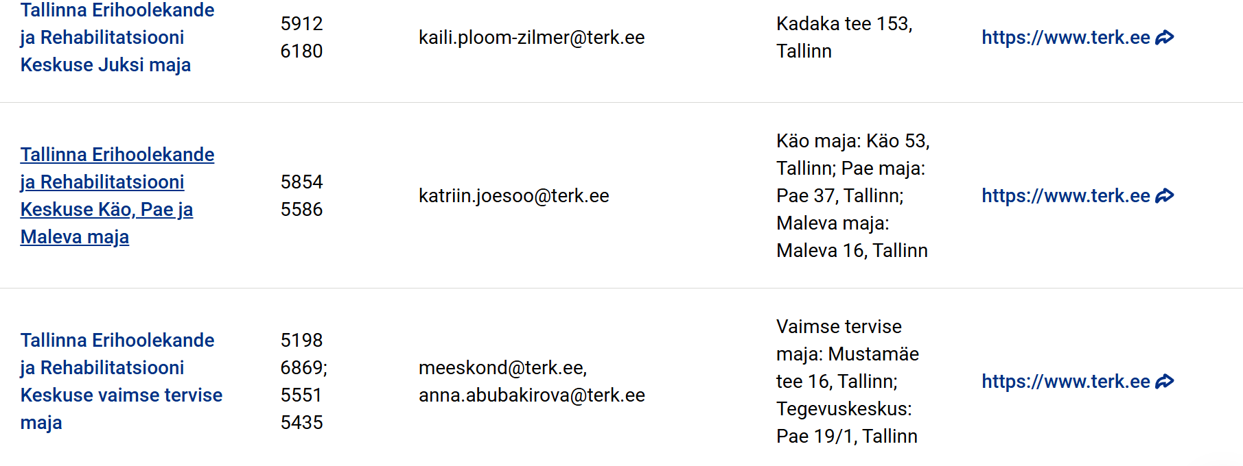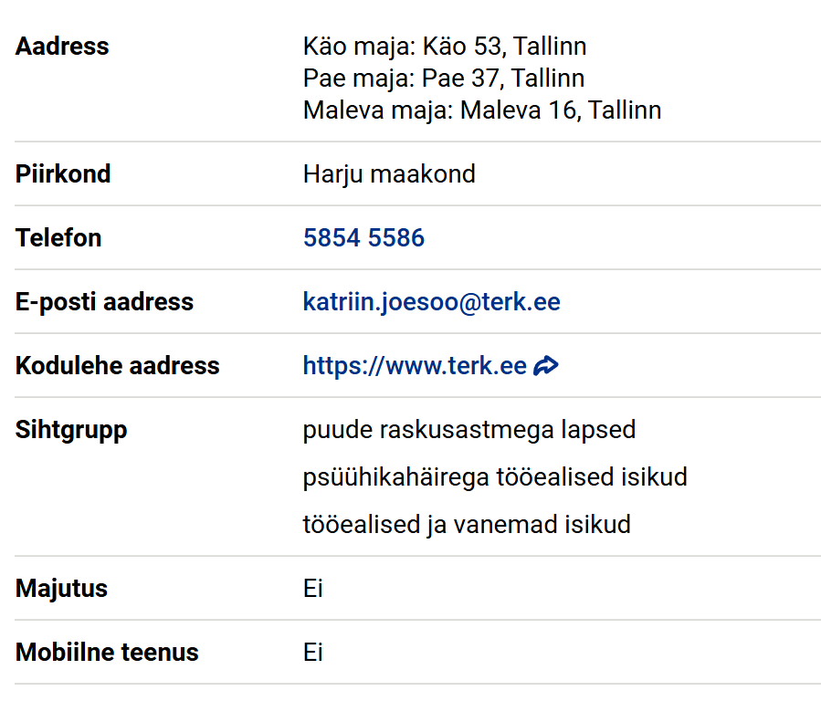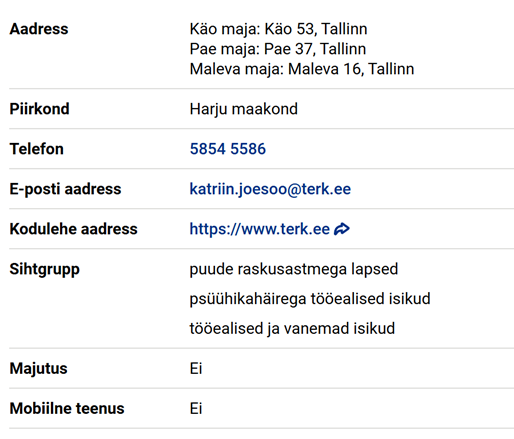 Soovin, et meie teenus oleks ühel real avatav ja oleks kuvatud Tallinna Erihoolekande- ja Rehabilitatsiooniteenuste Keskus (eraldi maju ei ole vaja siin real välja tuua), telefon 5854 5586 [email protected] ja Käo 53, Tallin, Pae 19/1, Tallinn, Maleva 2a, Tallinn, Maleva 16, Tallinn, Mustamäe tee 16, Tallinn, Kadaka tee 153, Tallinn