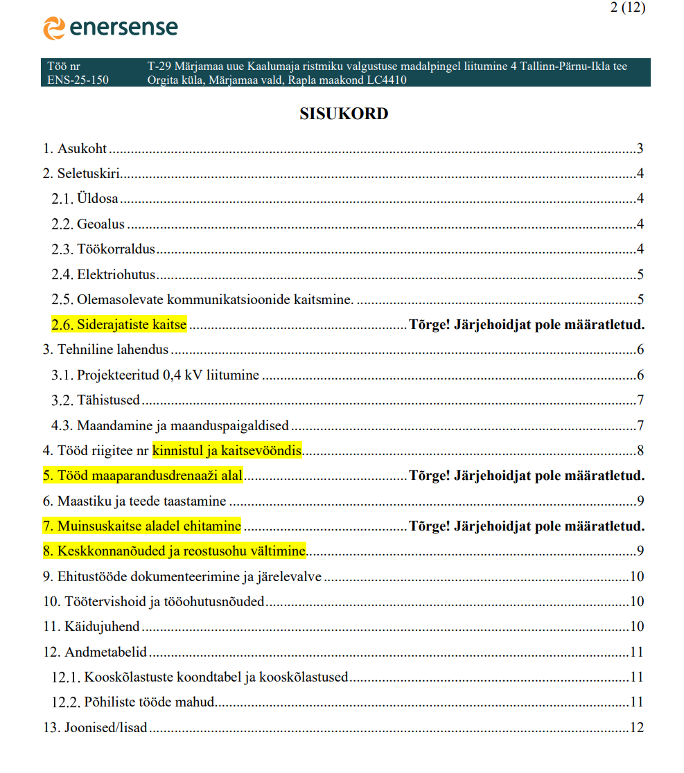 7. Ehitustööde dokumenteerimine ja järelevalve Ehitustööde dokumenteerimine teostatakse vastavalt Ehitusseadustikule ja vastavalt tellija poolt kehtestatud nõuetele. Kõik kõrvalekalded projektis fikseeritakse vastavates protokollides ja kooskõlastatakse objekti projekteerijaga ning tellijapoolse ehitusjärelevalvega. Projektile mittevastava ja kooskõlastamata ehitustegevuse eest vastutab ehitaja. Ehitaja esitab tellijale elektripaigaldise auditi ja teostusdokumendid. Tellija ja töövõtja poolt vastuvõtu ajal märkimata jäänud vead ja puudused ei vabasta töövõtjat vastutusest