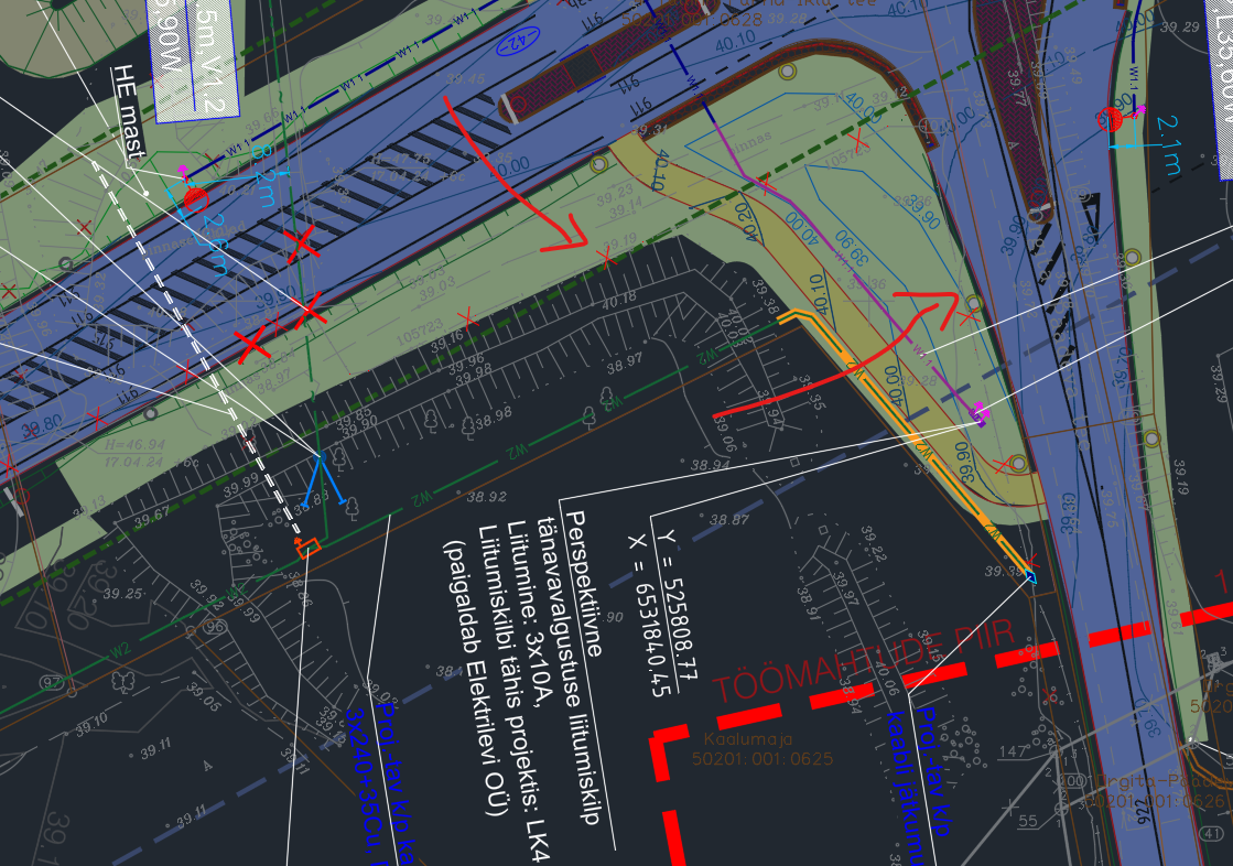 Ettevaatust! Ristumine olemasoleva keskpinge maakaabliga. NB! Ristumisel kaevata käsitsi ja otsida surfides olemasolevate kommunikatsioonide asukoht.