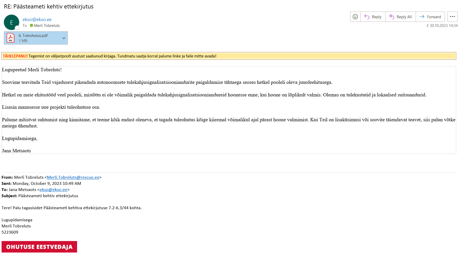 | Vastutaja | Merli Tobreluts (Lõuna päästekeskus, Ohutusjärelevalve büroo) |