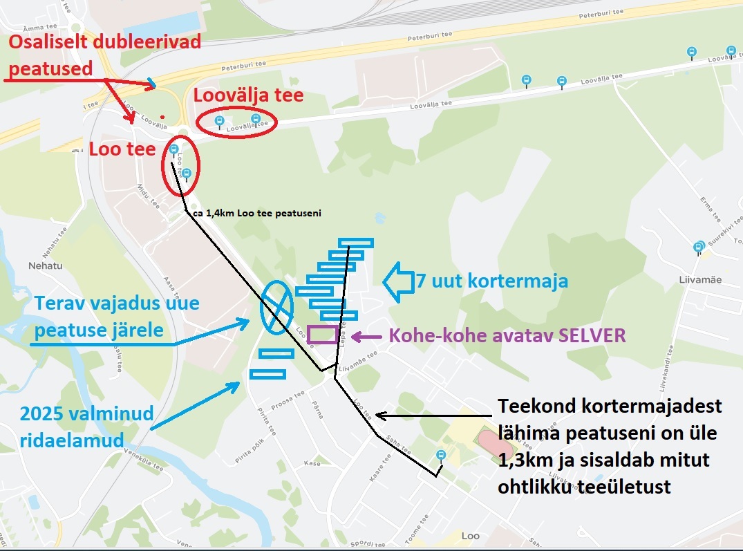Uus peatus jääks siis ligikaudu 860m kaugusele Loo keskuses olevast bussipeatusest ja ligikaudu 600m kaugusele Loo tee Peterburi maantee poolses olevast Loo tee peatusest.