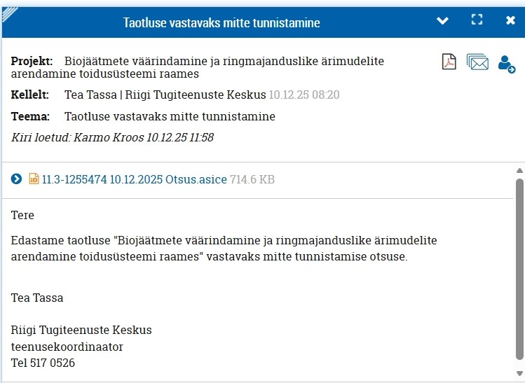 sai taotleja esindaja ja projektijuht Karmo Kroos otsuse kätte samal kuupäeval 10.12.2025 kell