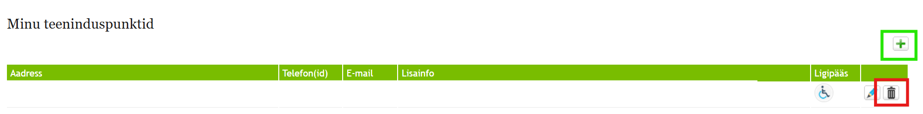 Rohelise kastiga „+“ nupp on mõeldud uute teeninduspunktide lisamiseks, kuid nagu ma eelnevalt kirjutasin, on see hetkel parandamisel. Kui on korras, siis saate selle abil uued õiged aadressid lisada.