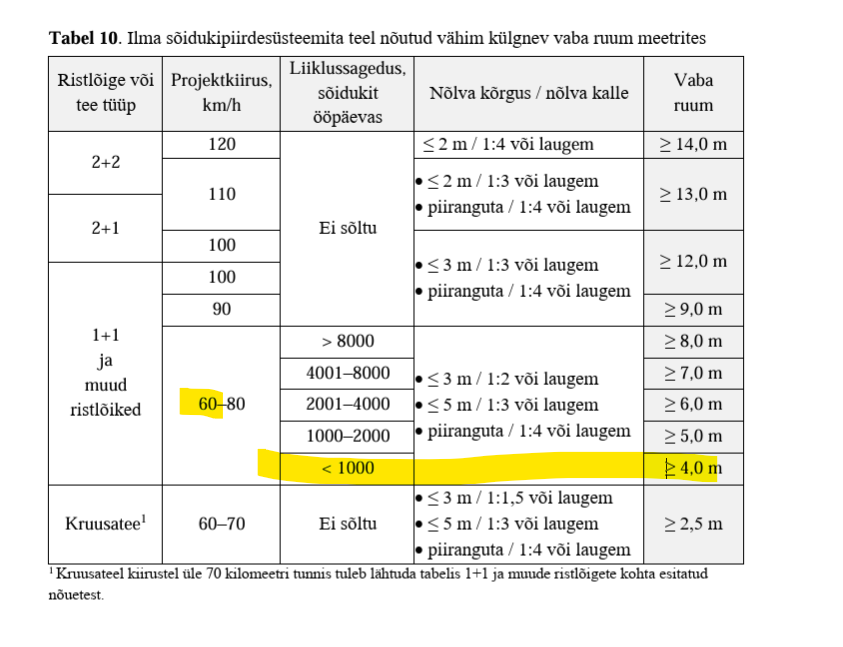 Juhul kui valgustusmasti nihutada teest eemale, nii et valgustusmasti (mitte jalandist) kaugus riigitee äärest on 4,0m siis võib jääda tavaline metallmast. Sellisel juhul palume asendiplaanil kajastada kaugus mastist (mitte jalandist) riigitee ääreni ka asendiplaanil. Juhul kui antud kujul pole võimalik lahendada, siis palume materjalides (seletuskirjas, asendiplaanil) kajastada, et rajatakse HE masti mis vastab standardi EVS-EN 12767 nõuetele.