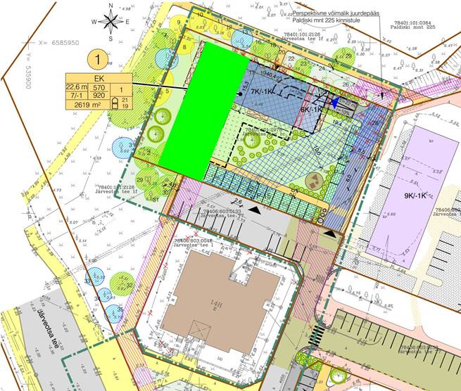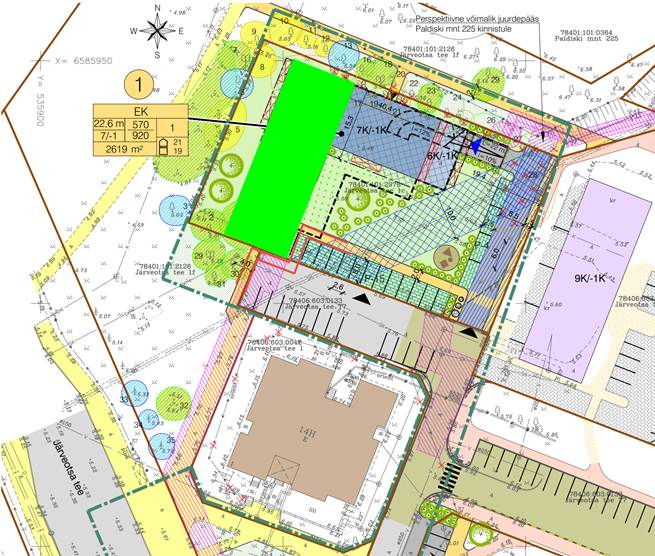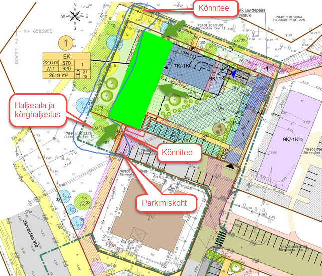 Krundi piiri ja hoone vahele oleme planeerinud teha haljasala. Lisaks on meil tarvis tagada jalakäijate vaba läbipääs kinnistult. Seega peame nii lõuna- kui põhjaküljele planeerima kõnniteed, mis tagavad vajalikud läbipääsud.