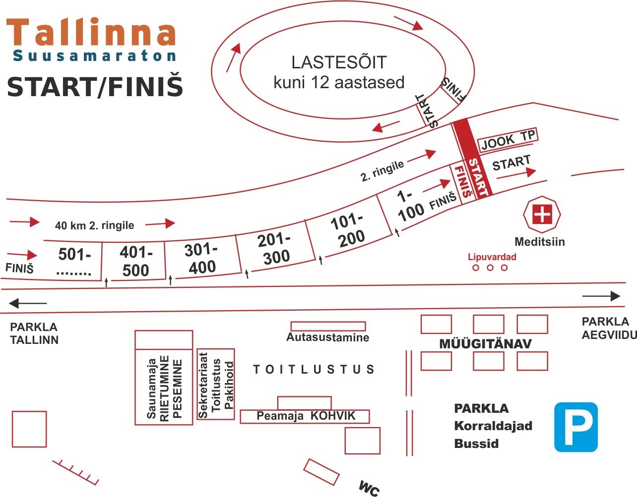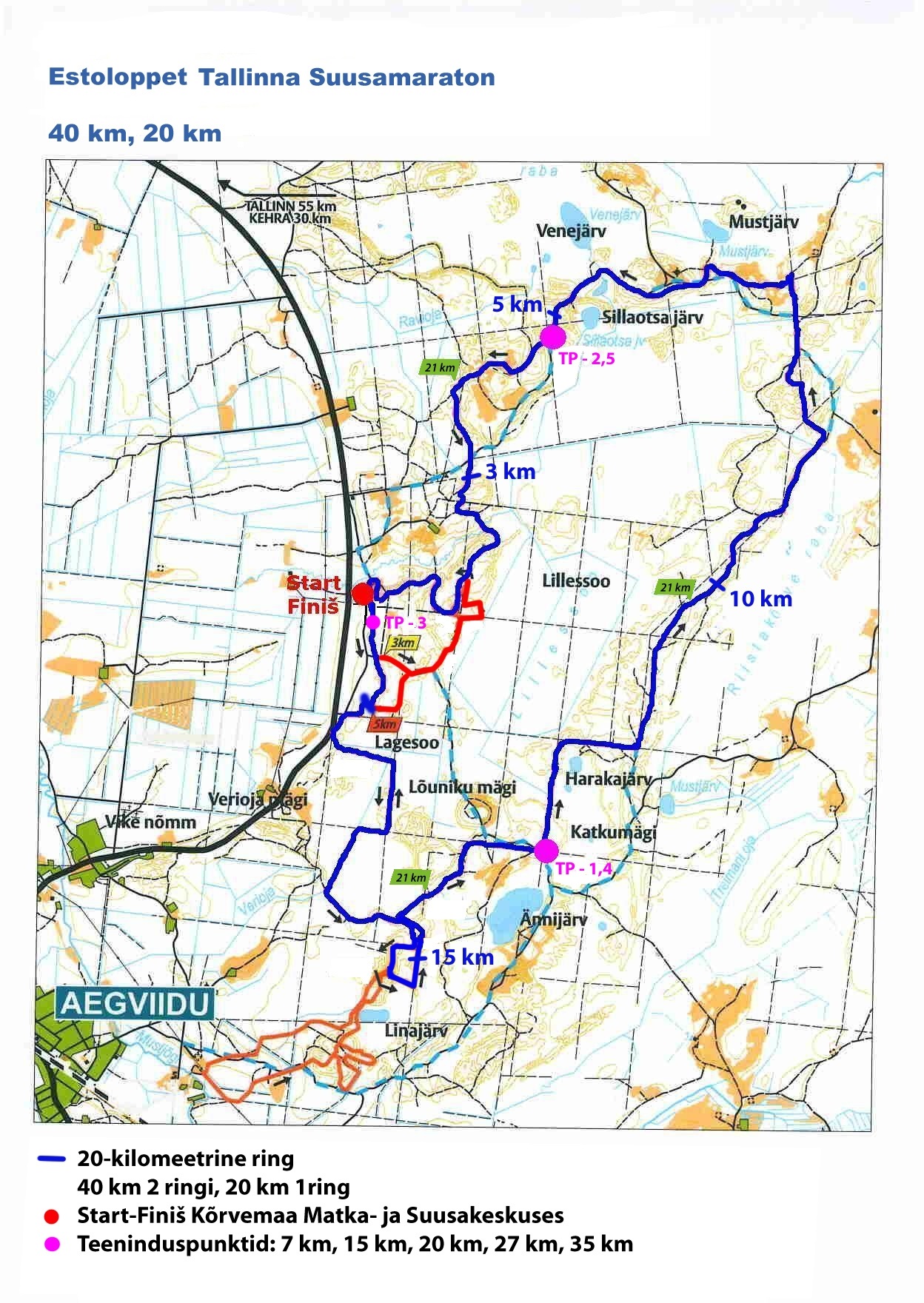 Start/Finiš Kõrvemaa Matka- ja Suusakeskus Algus: 38 km start kell 11.00 19 km start kell 11.15 Lastesõidud kell 11.20 12-a ja nooremad (200 – 600m) Maratonirada suletakse kell 16.30 Teisele ringile pääs suletaks kell 13.30 OSAVÕTJATELE KINDLUSTATAKSE: hooldatud maratonirada; ajavõtt (ainult korrektselt paigaldatud rinnanumbri ja kiibi olemasolul stardist finišini); infoleht; teenindus ja toitlustus finišis ja TP-des( 38 km rajal 2 TP, 19 km rajal 1 TP); vajadusel arstiabi; võimalus diplom välja trükkida www.estoloppet.ee keskonnas; tulemus Tallinna Suusamaratoni lõpuprotokollis vanusegruppide kaupa. Tasuline suusamäärimisteenus 21.02.2026 hommikul firmadelt SKIWAX, Sportland.