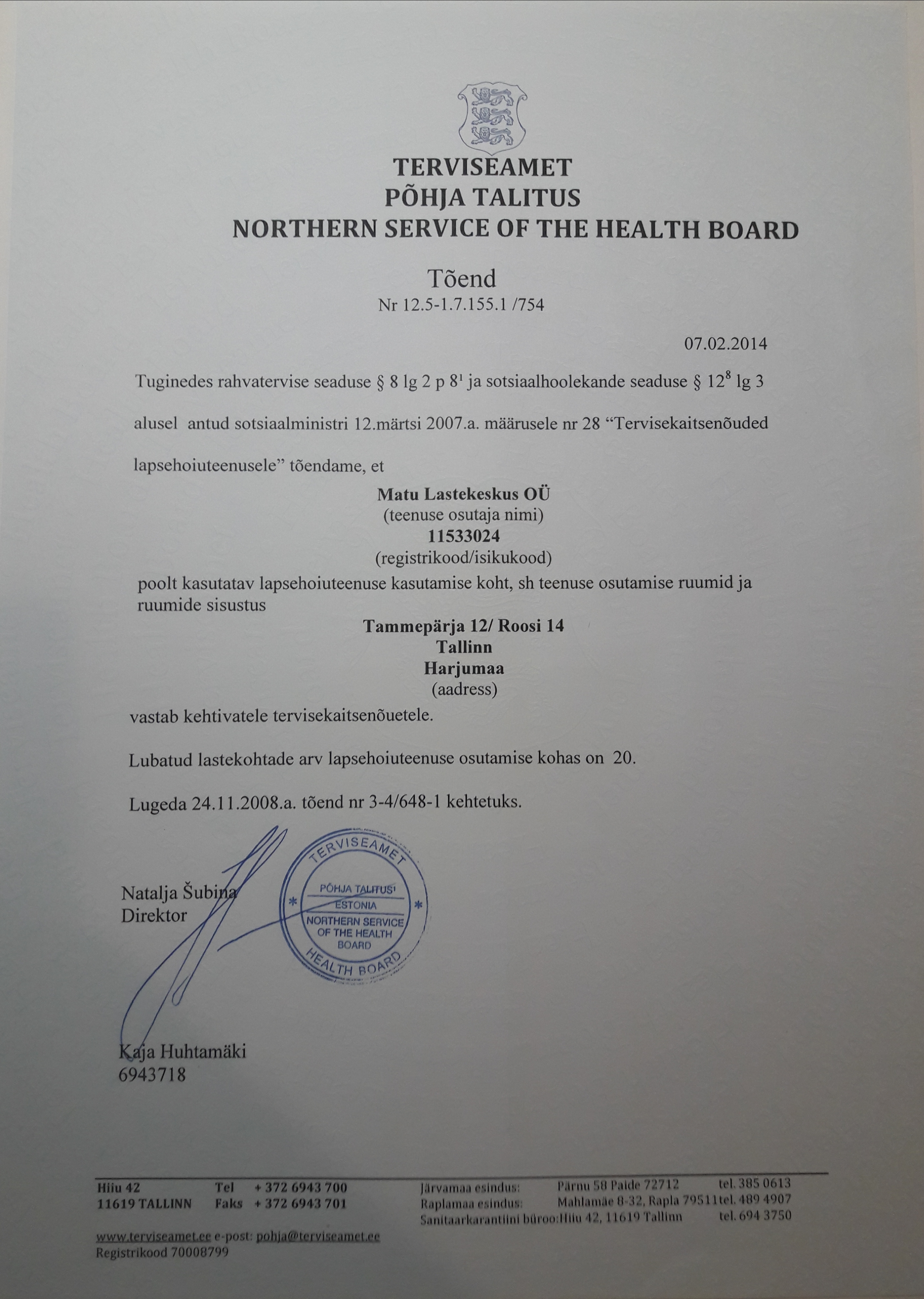 Meil on väljastatud varasemalt Terviseameti tõend ruumide vastavuse kohta, aga uue loa taotlemisel vajame uut tõendit või Terviseameti kinnitust, et ruumid vastavad nõuetele. Kuna ametnikku, kellega varasemalt oleme suhenud enam teie juures ei tööta, siis kirjutasime teile.
