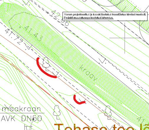 Tee peenardel paikneva murukamara kõrgus ei tohi takistada vee äravoolu tee pinnalt. Vajadusel tuleb peenrad profileerida, et tagada vee äravool. Kraavides tuleb teostada niitmist sagedusega, mis takistab kraavide kinni kasvamise. Teedelt ei tohi lükata soolatud lund teeäärsetele puudele ja põõsastele. 3. Ristumised liinide, kaablite, torustikega Elekti õhuliin ja maakaablid (Elektrilevi OÜ) ETTEVAATUST KASVUPINNASE KOORIMISEL! Tööde teostamine kaabli kaitsevööndis võib toimuda kooskõlastatult kaabli haldaja järelevalvajaga! Järelvalve juuresolekul kontrollida kaabli täpne sügavus. Kui teekatte all pinnase väljakaevamisel jääb kaabli peale vähem kui 30cm pinnast, tuleb kaabel kaitsta poolitatava kaitsetoruga de110. VK kaevetöödel toestada kaablid nõuetekohaselt. Õhukaabli läheduses järgida kõrguspiiranguid! Ettevaatust kalluriga kallutamisel ja tõstetöödel! Täita võrguvaldaja kooskõlastuses märgitud tingimused! Side maakaabel (Telia Eesti AS) Tööde teostamine sidekaabli kaitsevööndis võib toimuda võrguvaldaja kirjaliku tööloa olemasolul ja kooskõlastatult trassi haldaja järelevalvajaga! Järelvalve juuresolekul kontrollida trassi täpne sügavus. Planeeritava tee kohal Telia sideehitised süvendada normatiiv sügavusele, kui see on tehniliselt teostatav (1m teekatendist sõidu-, sissesõiduteel ja parklate kohal; 0,7m haljasalal), vastasel juhul kaitsta pealt betoon plaatidega. Täpsed juhised annab võrgu omaniku järelevalve peale trassi lahtisurfimist. VK kaevetöödel toestada kaablid nõuetekohaselt. Enne kinni katmist, korraldada Telia esindajaga Telia sideehitiste kaitsmise korralised ülevaatused. Teostatud töödele koostada Telia järelevalve spetsialistiga kaetud tööde akt. Täita võrguvaldaja kooskõlastuses märgitud tingimused! Vee- ja kanalisatsioonitrass (Raven OÜ) Enne kaevamistöödega alustamist kutsuda kohale Raven OÜ esindaja. Kontrollida liitumiskaevud, lokaliseerida olemasolev survekanalisatsiooni asukoht ja sügavus. Kontrollida liituvate veeterode suurus ja materjal. Ehitamisel tuleb kasutada mehhanisme, töövõtteid ja –meetodeid, mis välistavad ühisveevärgi ja -kanalisatsioonivõrgu kahjustamist. Kõigi ehitusperioodil töömaal tekkinud vigastuste likvideerimine toimub ehitustööde teostaja ja vastutaja kulul. Täita võrguvaldaja kooskõlastuses märgitud tingimused!