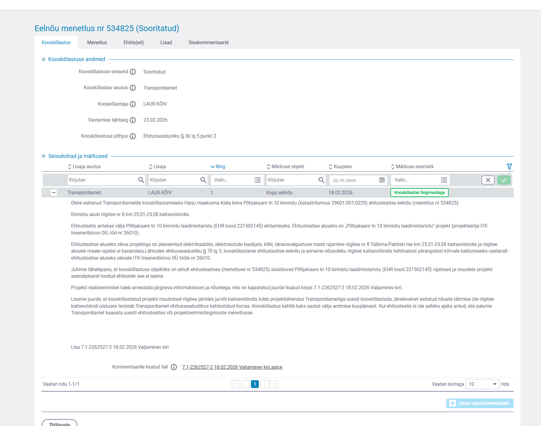 Juhime tähelepanu, et kooskõlastuse objektiks on ainult ehitusteatises (menetluse nr 534825)