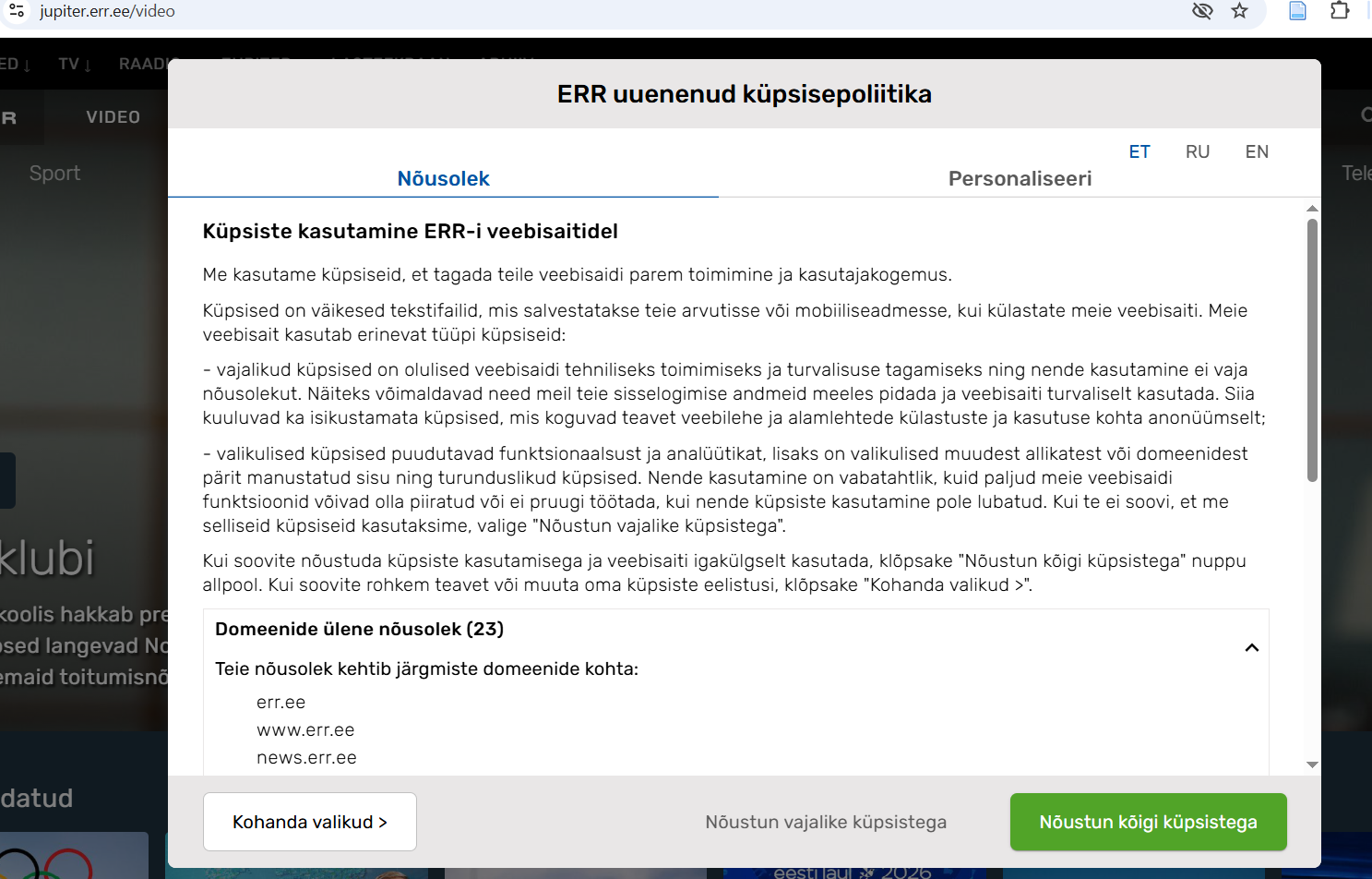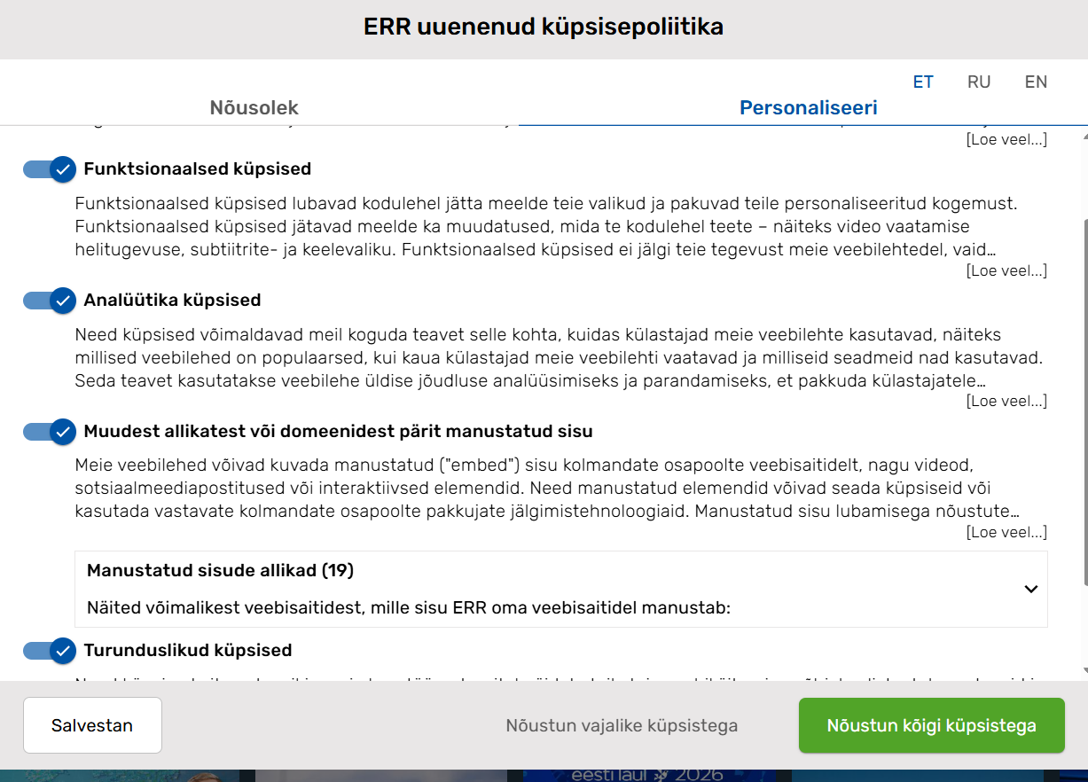 Teiseks, kui avada nt Jupiteri lehel küpsiste kohandamise valikud, siis on kõik küpsised juba sisse lülitatud valikus ehk kasutajale eelseadistatud küpsise lubamiseks. Ka selline küpsise valiku eelseadistamine peaks olema andmekaitses lubamatu.