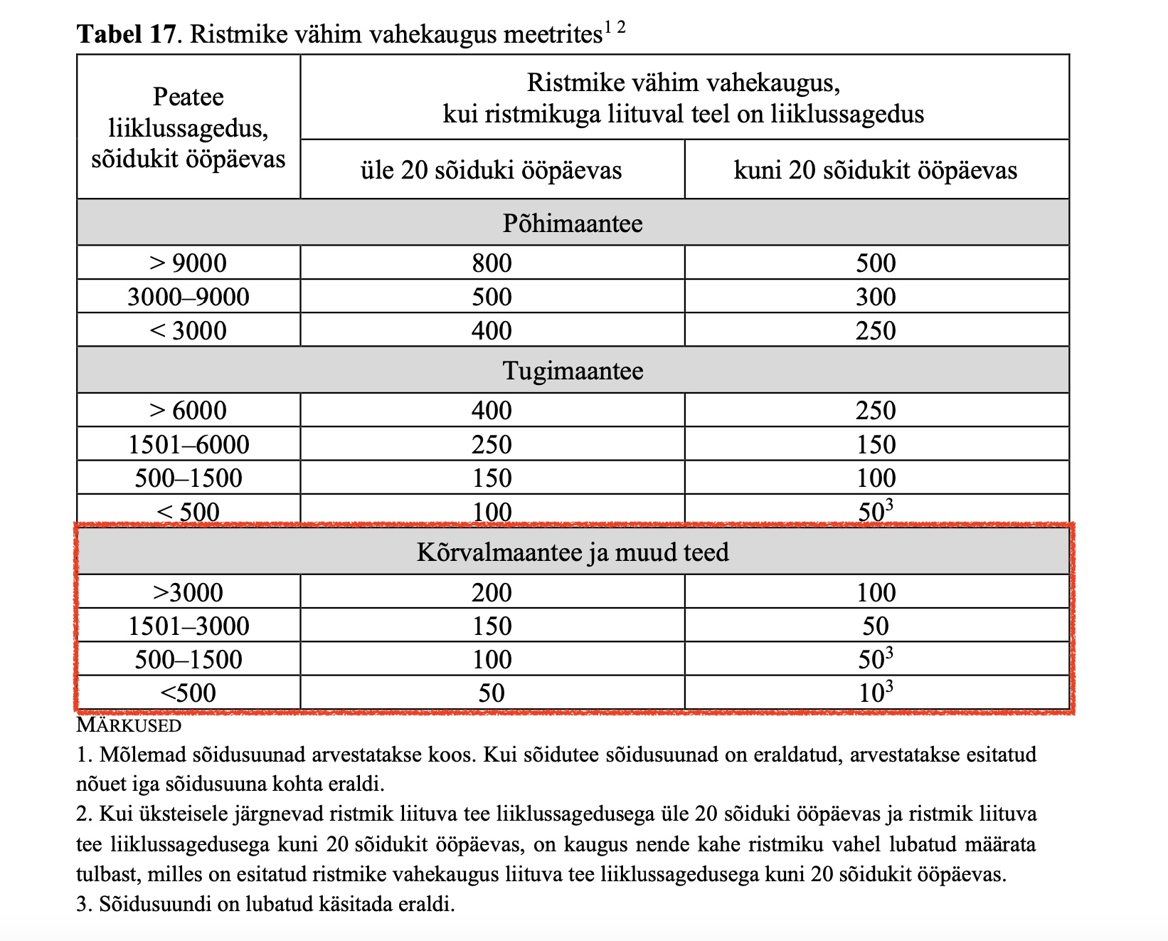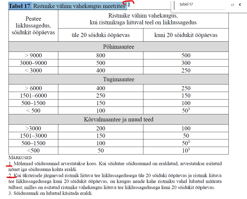 Juhindudes eeltoodud punktidest -olemasolevate ristmike vahekauguse mõõtmisel tuleb arvestada teisel pool riigiteed oleva ristmikuga ning mõõtmine toimub „ühe ristmiku või liiklussõlme lõpp-punktist järgmise ristmiku või liiklussõlme alguspunktini. Ristmiku ja liiklussõlme lõpp-ja alguspunktiks loetakse kohta, kus lõpeb või algab äärmine geomeetriline element, nagu kiirusmuuterada või kõverik.“