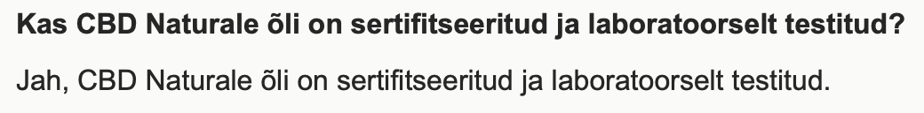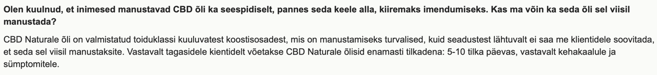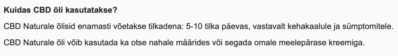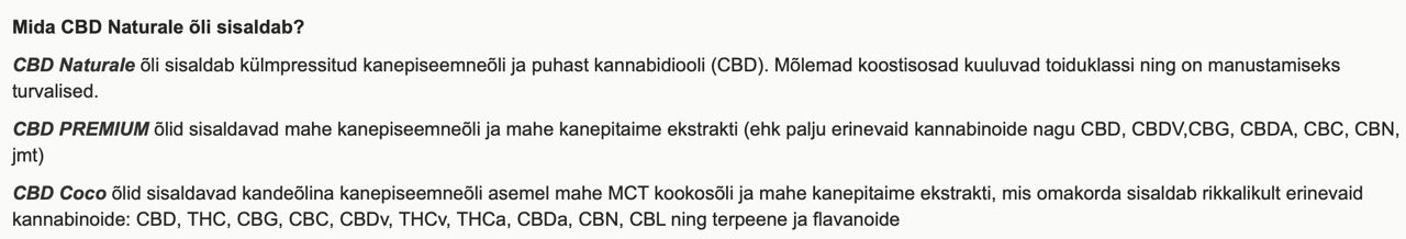 Kuvatõmmised Eesti firma kodulehelt (neil on ka e-pood), kes nii müüb kui ka toodab CBD sisaldusega õlisid: