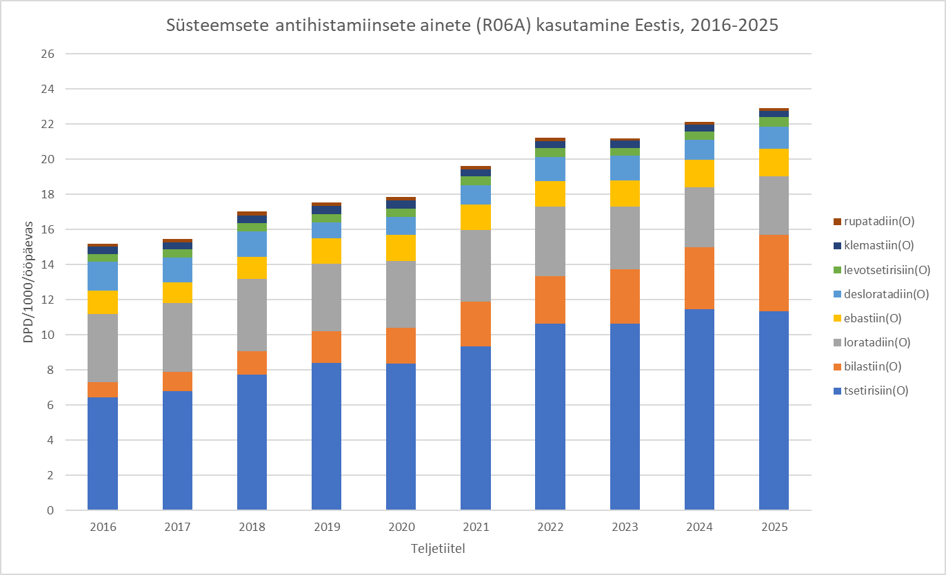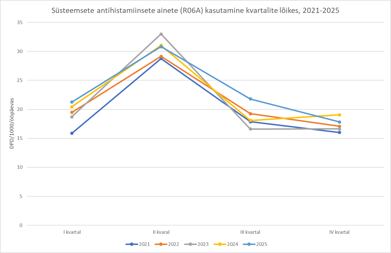 „Viimase 10 aasta lõikes näitab kasutamine mõõdukat/kerget kasvutrendi, keskmiselt +5% aastas. Kvartalite lõikes joonistub selgelt välja II kvartal (aprill, mai, juuni), kui allergiavastaste ravimite kasutamine pea kahekordistub. Seega hooajaliste allergiate osakaal on märkimisväärne.“