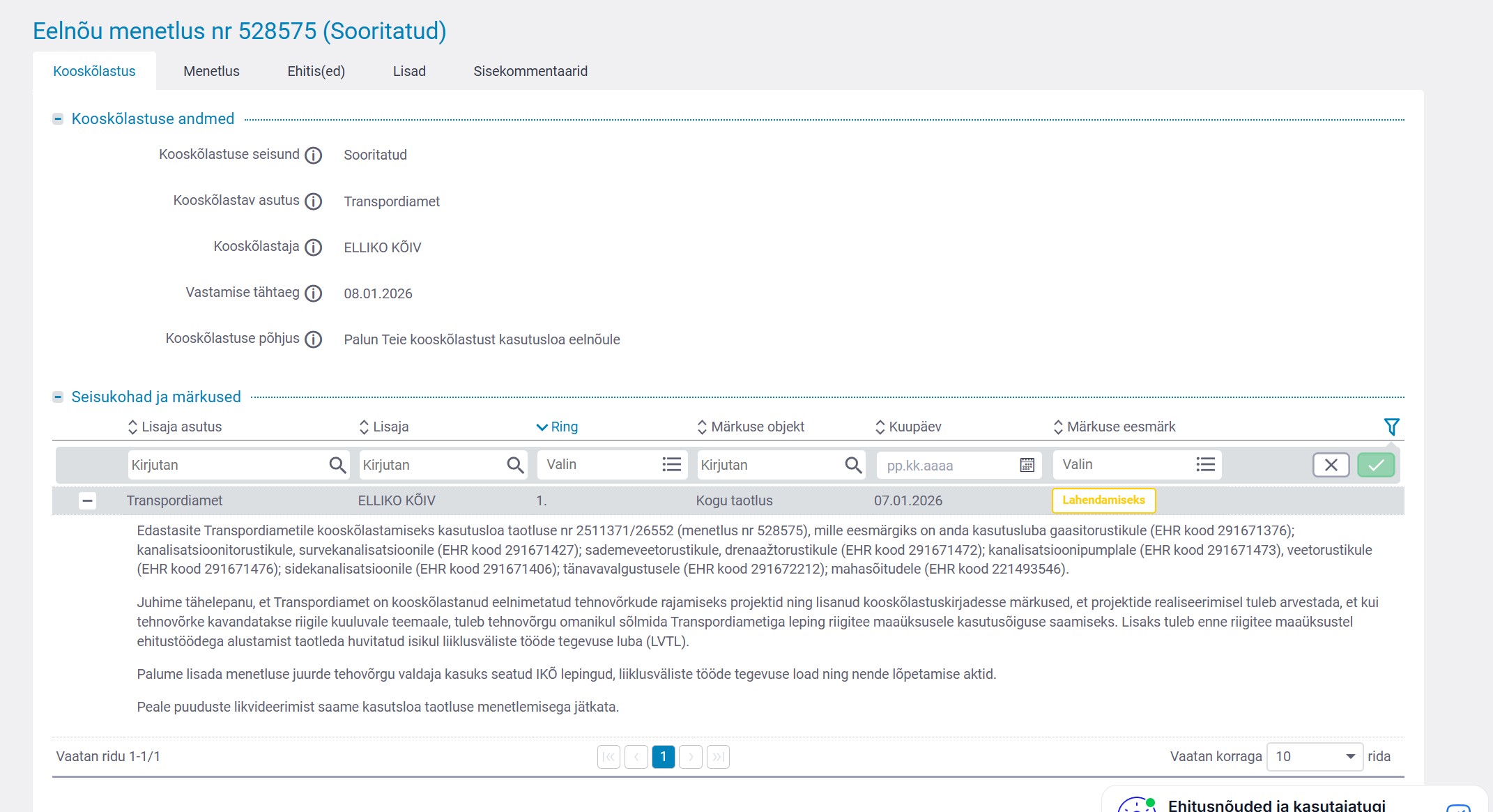 | Vastutaja | Elliko Kõiv (Users, Teehoiuteenistus, Planeerimise osakond, Tehnovõrkude üksus) |