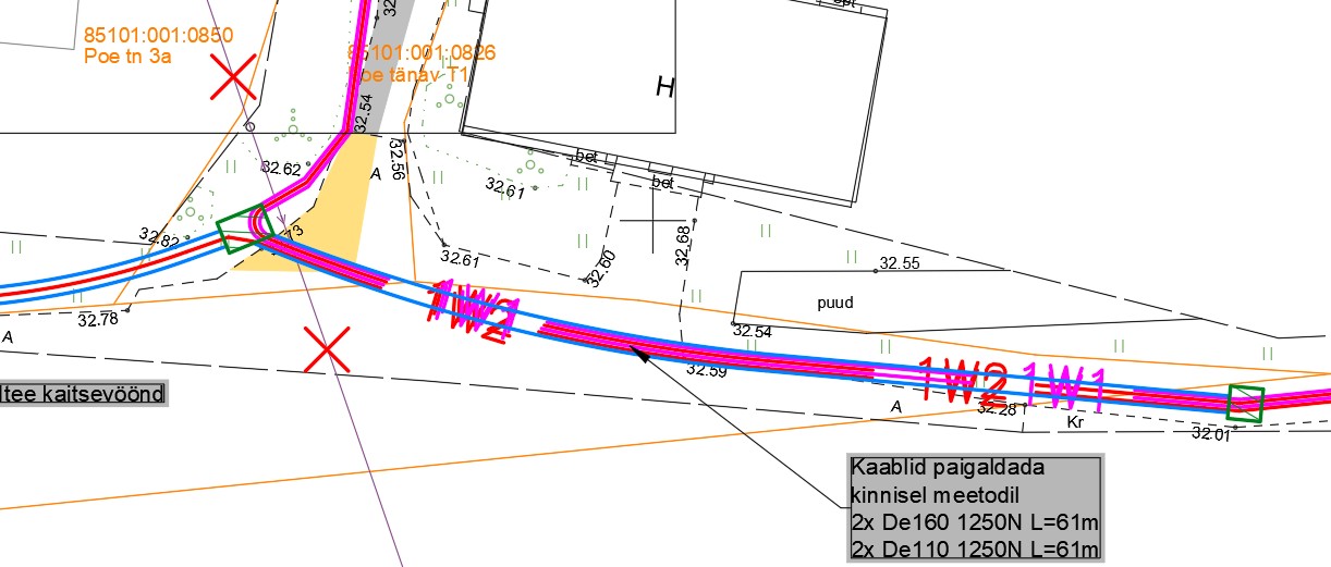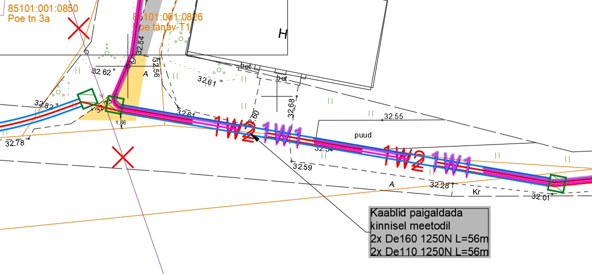 MÄRKUSED: Puurimiseks vajalikud lahtised kaevikud tähistatakse tööde tegemise perioodil puittähistega ja nende vahele tõmmatud värvilise märkelindiga. Lahtised kaevikud ei tohi olla avatud üle 3 päeva. Tehnovõrkude sügavused on tinglikud (EVR kaablite sügavused on eeldatavalt 0,9m), enne puurimist kutsuda kohale tehnovõrkude valdajad ja täpsustada tegelikud sügavused.