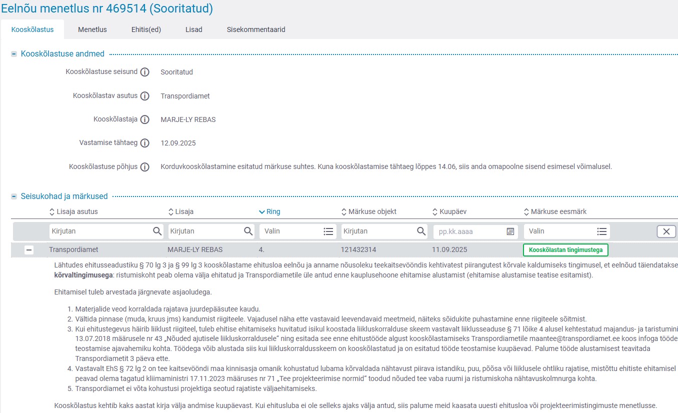 Palun avage eelnõu e-ehituse keskkonnas (menetlus nr: 469514), määrake omalt poolt kooskõlastuse eest vastutav kasutaja ja kontrollige eelnõu andmeid.