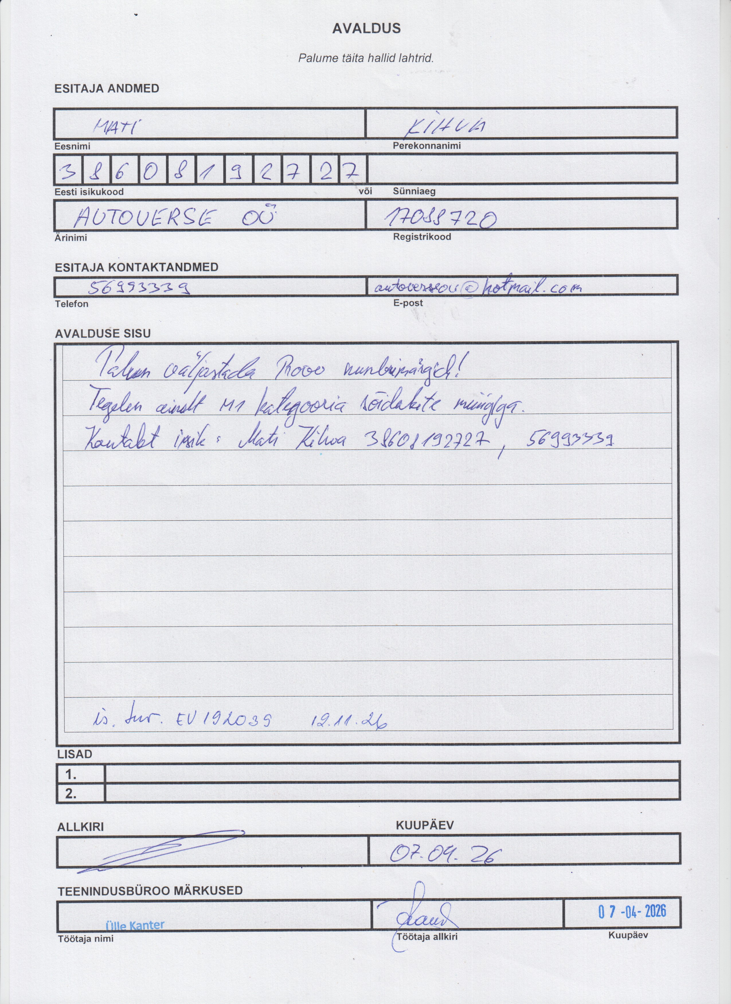 | Vastutaja | Ülle Jantson (Users, Liiklusteenistus, Klienditeeninduse osakond, Põhja üksus, Tallinna teenindusbüroo) |