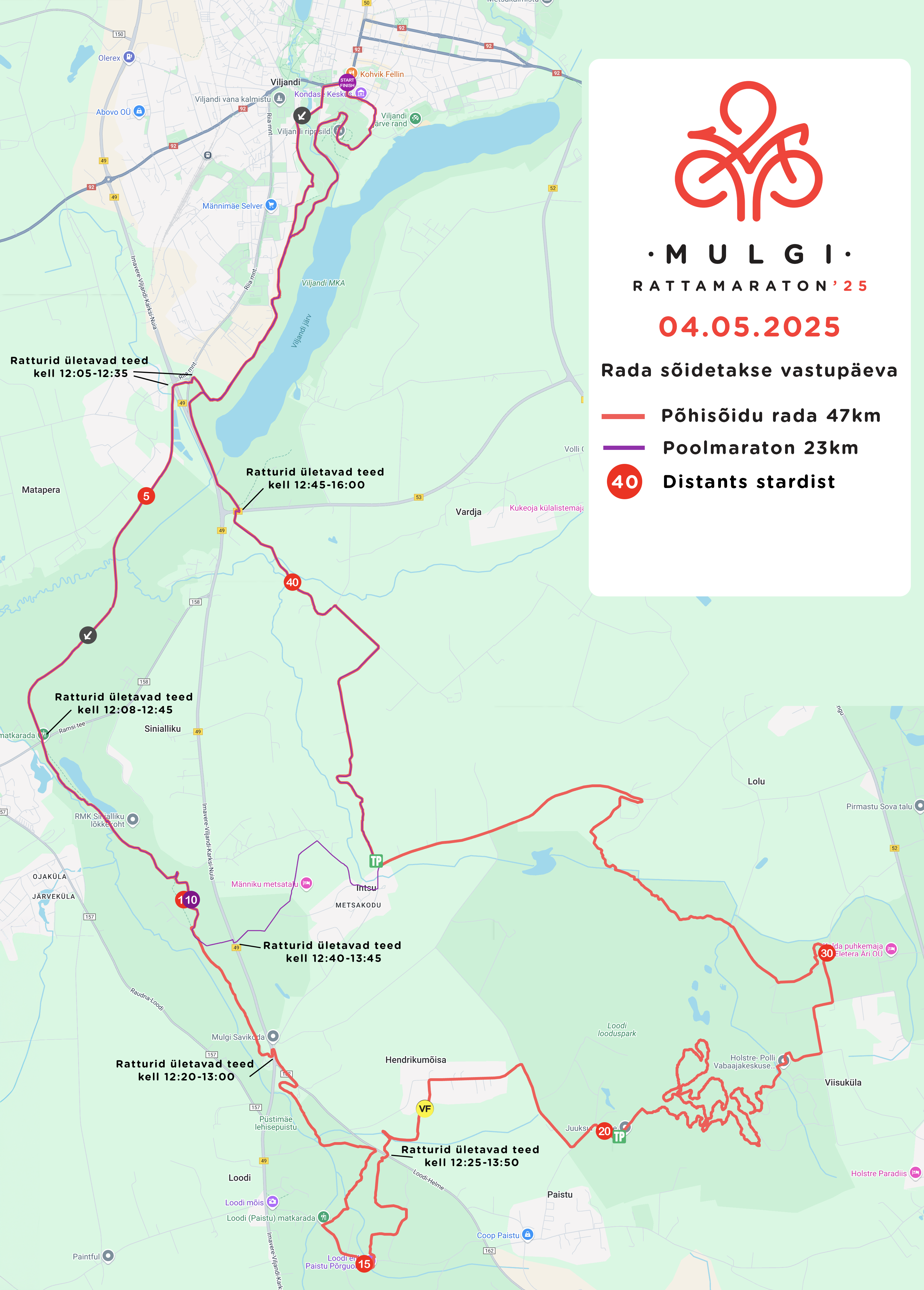 Transpordiamet Lääne regioon, Viljandi esindus Avaldus Viljandi Rattaklubi soovib 03. mail 2026.a. korraldada XXVI Mulgi Rattamaratoni, mis kulgeb maršuudil Viljandi – Sinialliku – Loodi - Holstre-Polli - Nõmme- Intsu – Viljandi. Rada kulgeb enamuses mööda erateid ning metsaradu aga ka mööda riigimaanteid, seoses sellega soovime kooskõlastust ürituse läbiviimiseks järgmistel teelõikudel; T-49 Heimtali ristmik ristumine teega suunaga vana raudtee matkarajale, T-158 ristumine endise Sinialliku jaama juures, T-49 59km Loodis Siniallikult suunaga Loodi-Helme teele, ristumine T-162 km 3 km lõiguti kuni Loodini ristumine teega, T-160 Loodi – Nõmme tee Pomrelt Intsuni T-53 1.kilomeetril ristumine teega Lühikesel sõidul T49 circa 57,6km ristumine teega. Ristumised tihedama liiklusega teedega (T-49 Heimtali ristmikul, Ramsi teel Sinialliku jaama juures, T-49 Loodi asulas, Loodi-Helme teel maha ja peale pöörded ning ristumine, Loodi- Nõmme teel peale ja maha pöörded, ristumine Orika - Laidu tee otsas ning T49 ristumine 57,6km) on plaanis turvata reguleerijate ja politsei abiga, lisaks kehtib tavapäraselt jalgratturitele ka võistlusolukorras Liikluseeskiri. Liiklusmärkide paigaldamiseks soovime võimalusel Teie liiklusohutuse peaspetsialisti abi ajutiste liiklusskeemide kontrollimisel. Lisa: Sakala Teed OÜ koostatud liiklusskeemid Lugupidamisega (Allkirjastatud digitaalselt) Toomas Leppik korraldaja