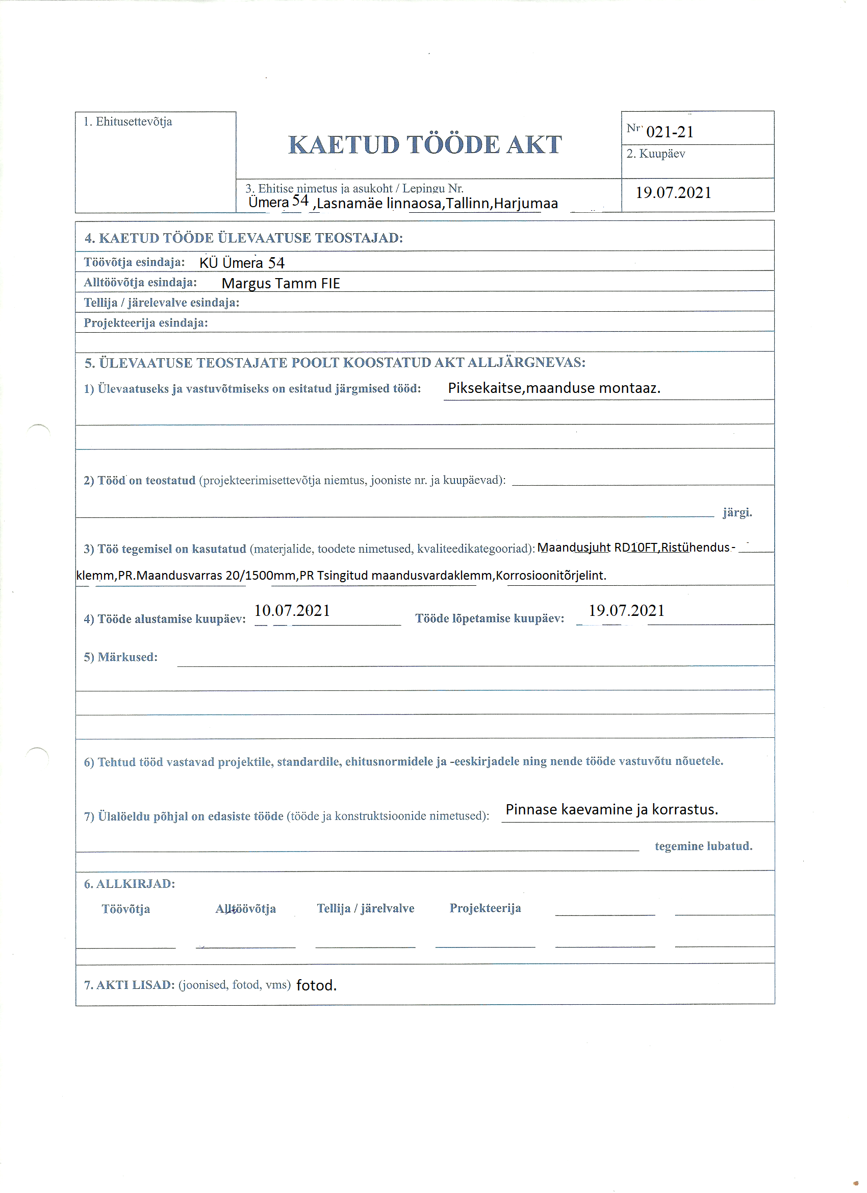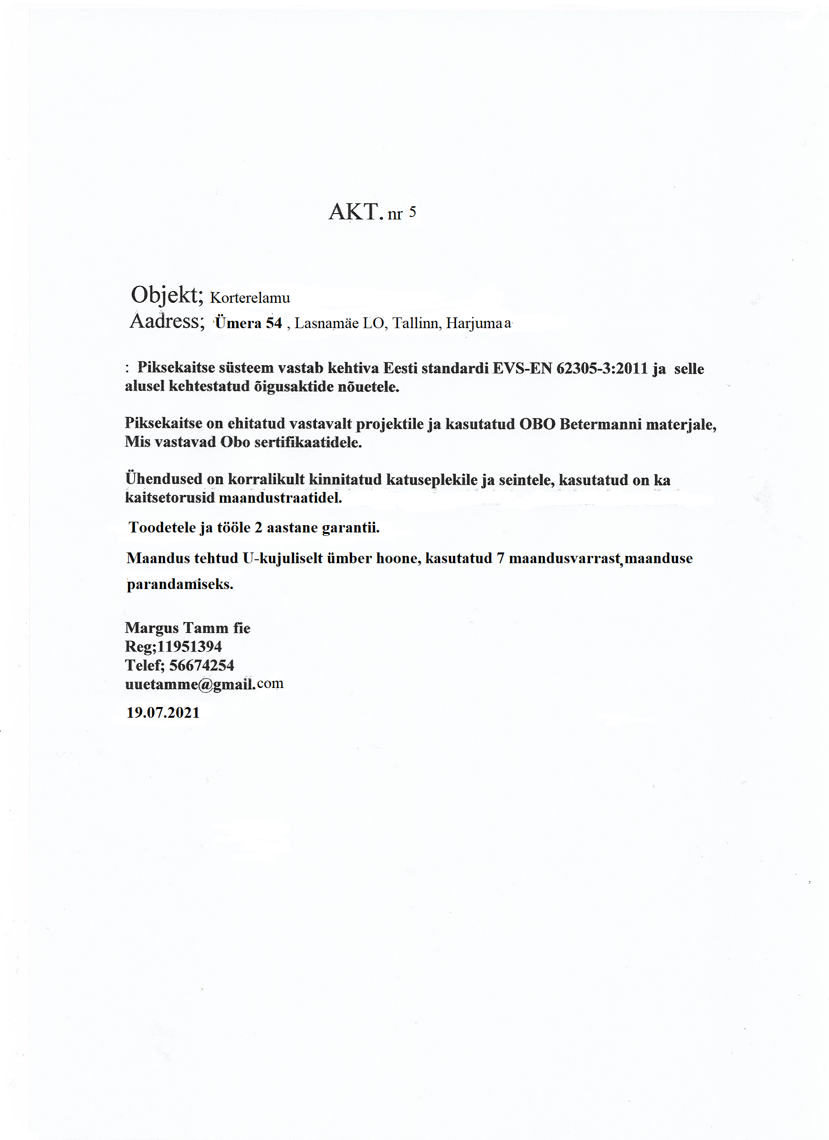 Tere, anname Teile teada, et piksekaitsesüsteemi tööd on teostatud juuli kuus 2021.a. Manuses - kõik dokumendid.
