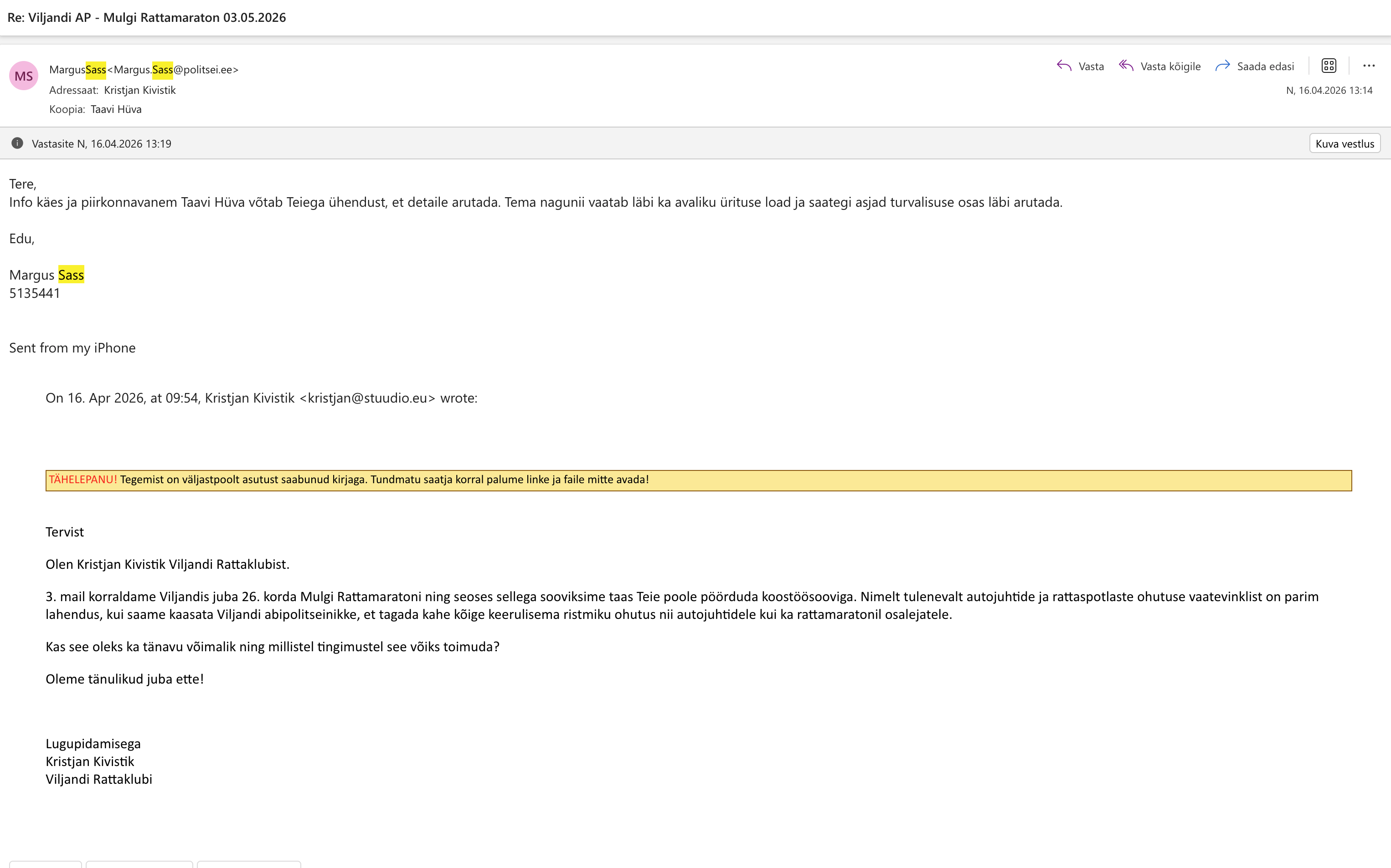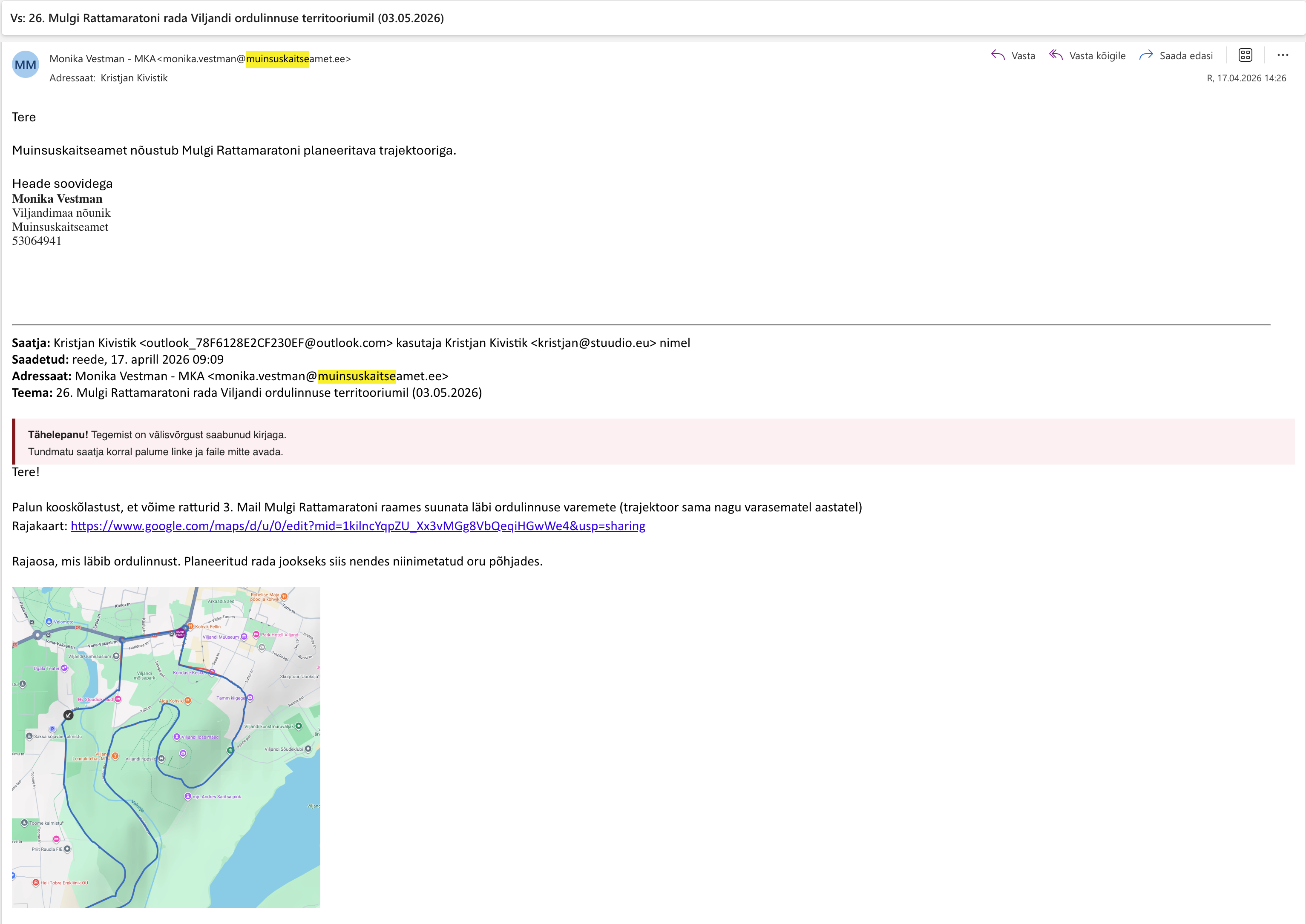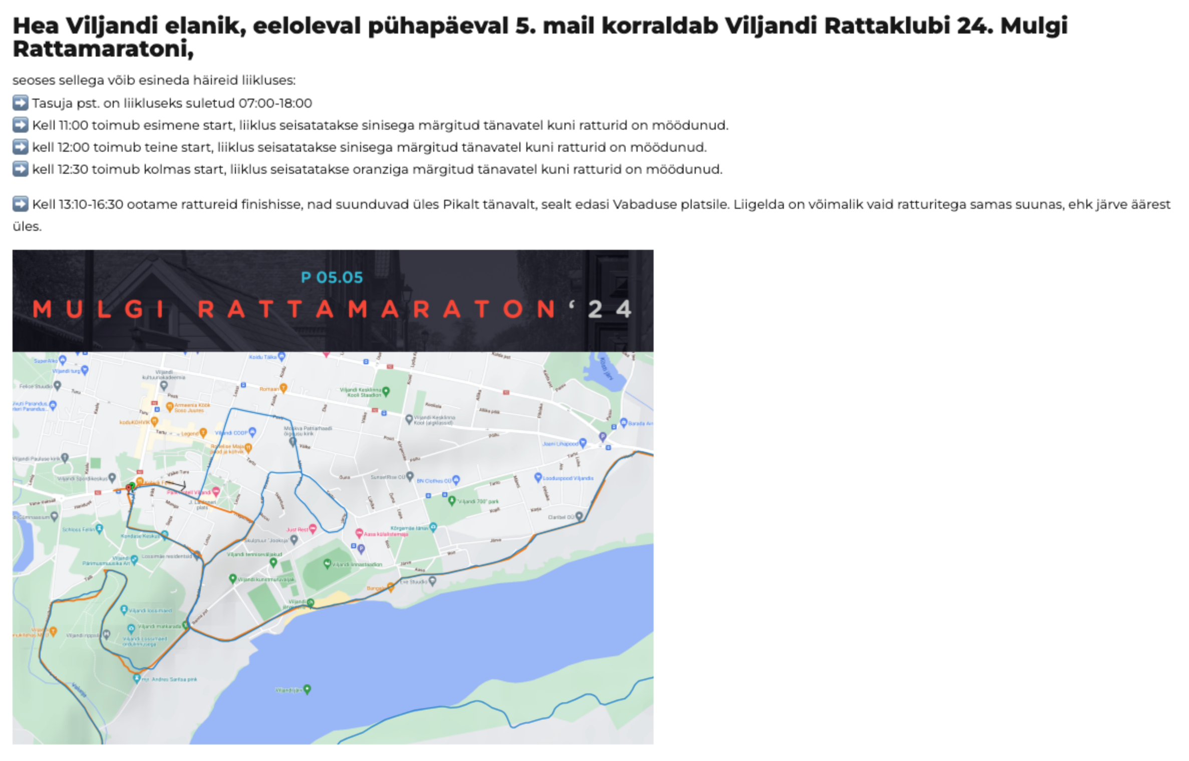edastan teile kooskõlastamiseks 3. mail toimuva 26. Mulgi rattamaratoni avaliku ürituse loa taotluse.