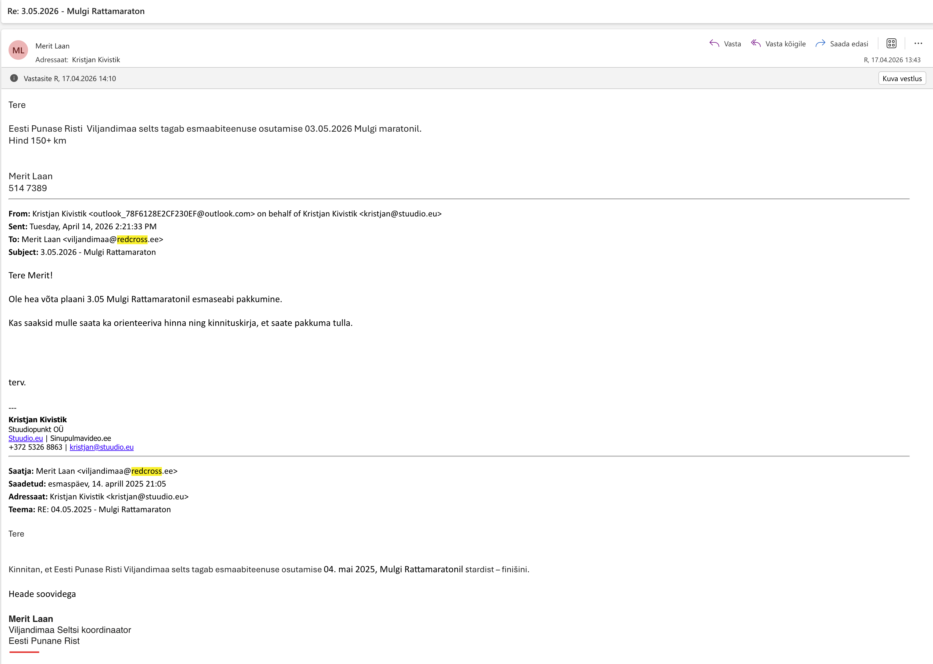 Pakkumine nr: P39963 / 19.03.2026 Klient: Viljandi Rattaklubi Kontaktisik: Kristjan Kivistik, 53268863, [email protected] Objekt/ürituse aadress: Mulgi XXVI Rattamaraton 03.05.2026 Periood: 03.05.2026 – 03.05.2026